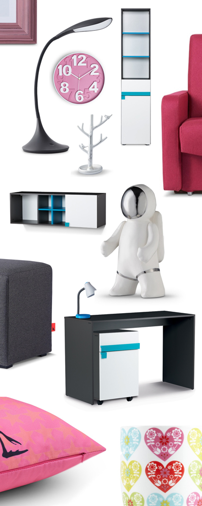 SHIBU. Posiada ono szeroki blat, odpowiedni do swobodnej nauki, jak i do korzystania z komputera. Idealnym dodatkiem do biurka będzie pojemny kontenerek z szufladą i półeczkami oraz lampka z kolekcji
