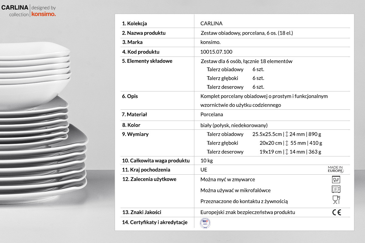 CARLINA zobacz całą kolekcję Serwis obiadowy kwadratowy 6 os. 18 elementów biały- kolor biały