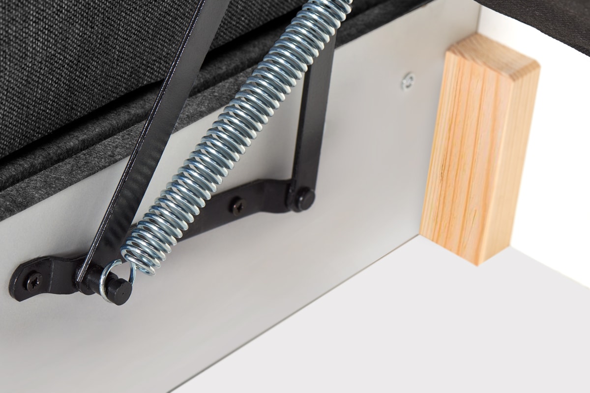 - Stelaż: płyta pilśniowa 3,2mm, wnętrze płyta wiórowa 16mm biała, zewnętrzna część skrzyni otapicerowana tkaniną techniczną