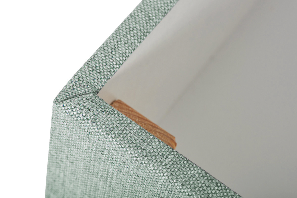 - Stelaż: płyta pilśniowa 3,2mm, wnętrze płyta wiórowa 16mm biała, zewnętrzna część skrzyni otapicerowana tkaniną techniczną