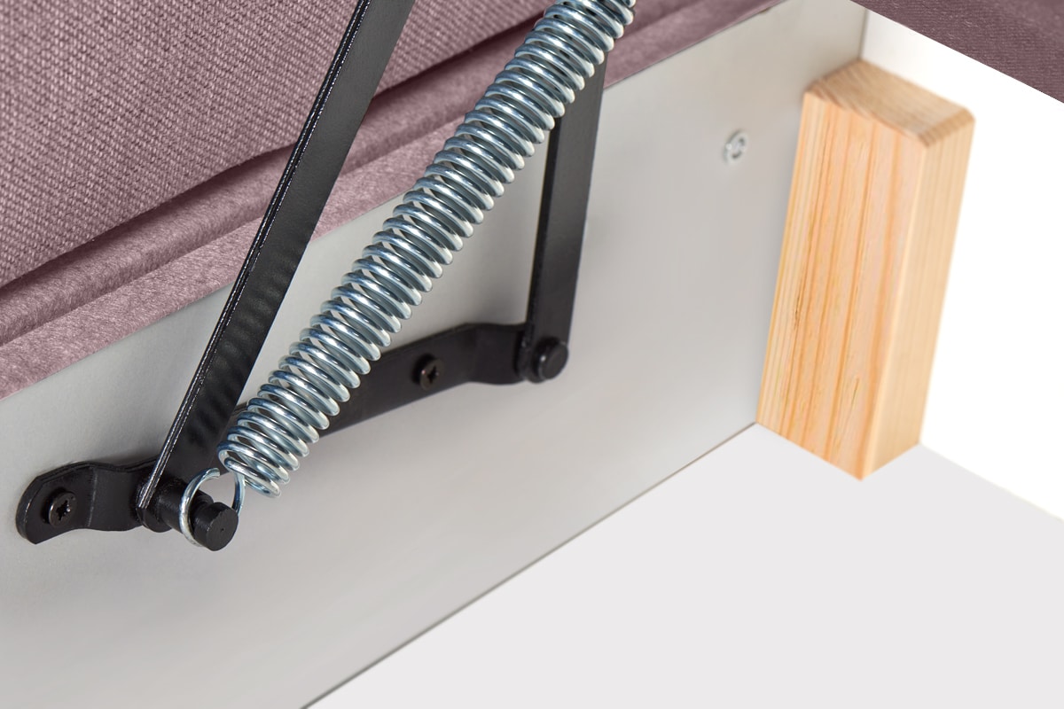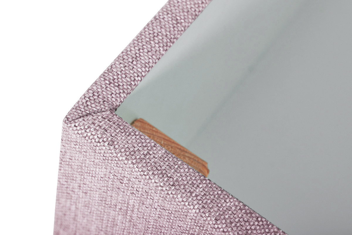 - Stelaż: płyta pilśniowa 3,2mm, wnętrze płyta wiórowa 16mm biała, zewnętrzna część skrzyni otapicerowana tkaniną techniczną