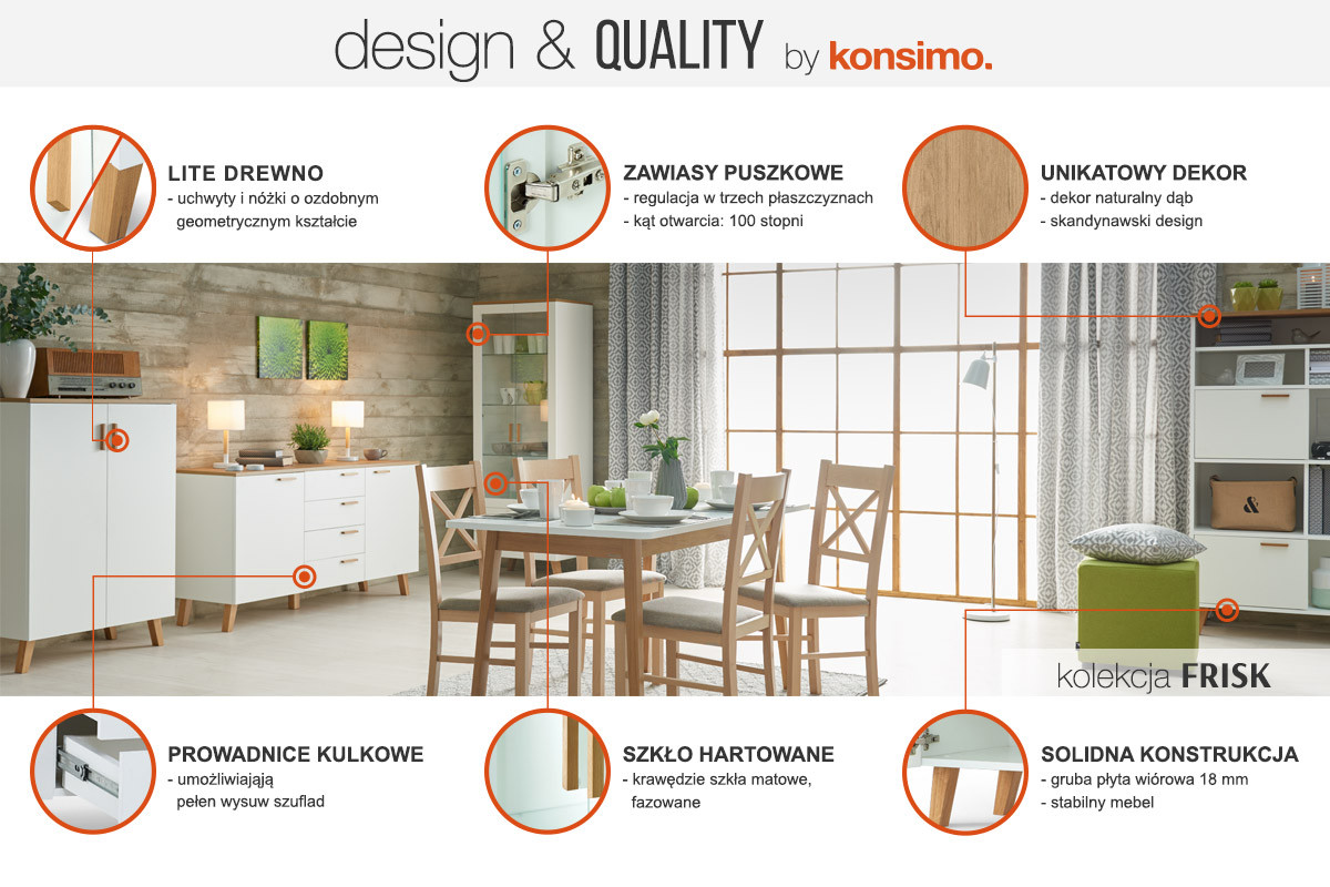 Projektanci skandynawskiej komody z kolekcji FRISK zadbali nie tylko o design, ale też o najwyższą jakość. Konstrukcję wspierają mocne nóżki z litego drewna – dzięki nim komoda jest stabilna i z powodzeniem znosi nawet duże obciążenie. Specjalne mocowanie tylnej ścianki dodatkowo wzmacnia mebel, a wytrzymałe zawiasy regulowane w trzech płaszczyznach ułatwiają jego sprawne użytkowanie.