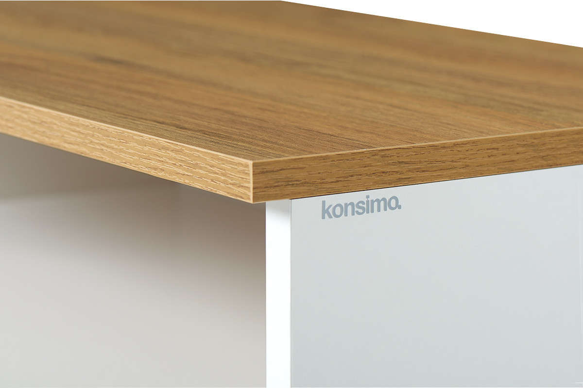 Posiadanie sprzętu RTV, chociażby telewizora, wymaga wyposażenia w odpowiednie meble. Biały kolor laminatu, drewniane nogi i wykończenia podkreślają jego skandynawski styl i nadają mu elegancji. Zaskakująca pojemność półki i szuflady pozwoli przechować różne przedmioty, dzięki czemu zachowamy większy porządek, ale również zagwarantujemy łatwy dostęp do potrzebnych akcesoriów. Wykorzystano w niej prowadnice kulkowe, które charakteryzują się pełnym wysuwem, a dodatkowo zawiasy puszkowe.