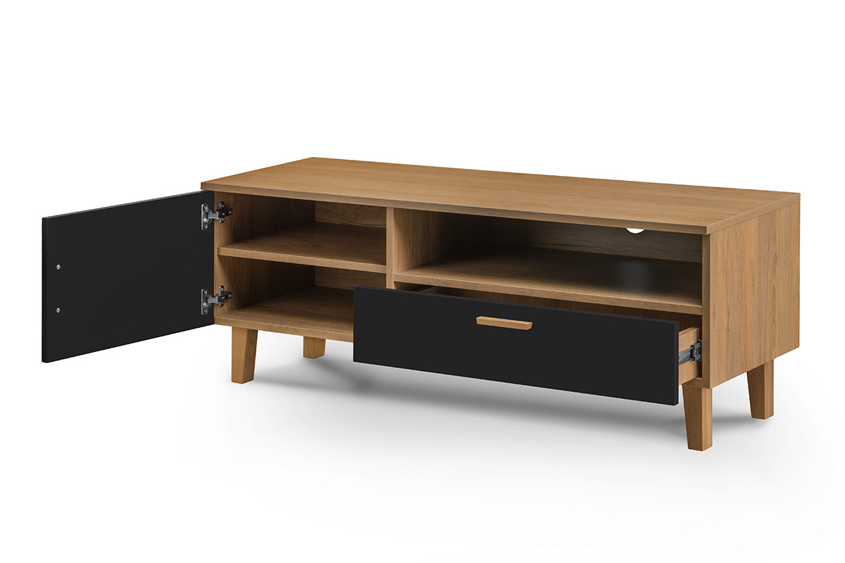 Posiadanie sprzętu RTV, chociażby telewizora, wymaga wyposażenia w odpowiednie meble. Czarny kolor laminatu, drewniane nogi i wykończenia podkreślają jego skandynawski styl i nadają mu elegancji. Zaskakująca pojemność półki i szuflady pozwoli przechować różne przedmioty, dzięki czemu zachowamy większy porządek, ale również zagwarantujemy łatwy dostęp do potrzebnych akcesoriów. Wykorzystano w niej prowadnice kulkowe, które charakteryzują się pełnym wysuwem, a dodatkowo zawiasy puszkowe.