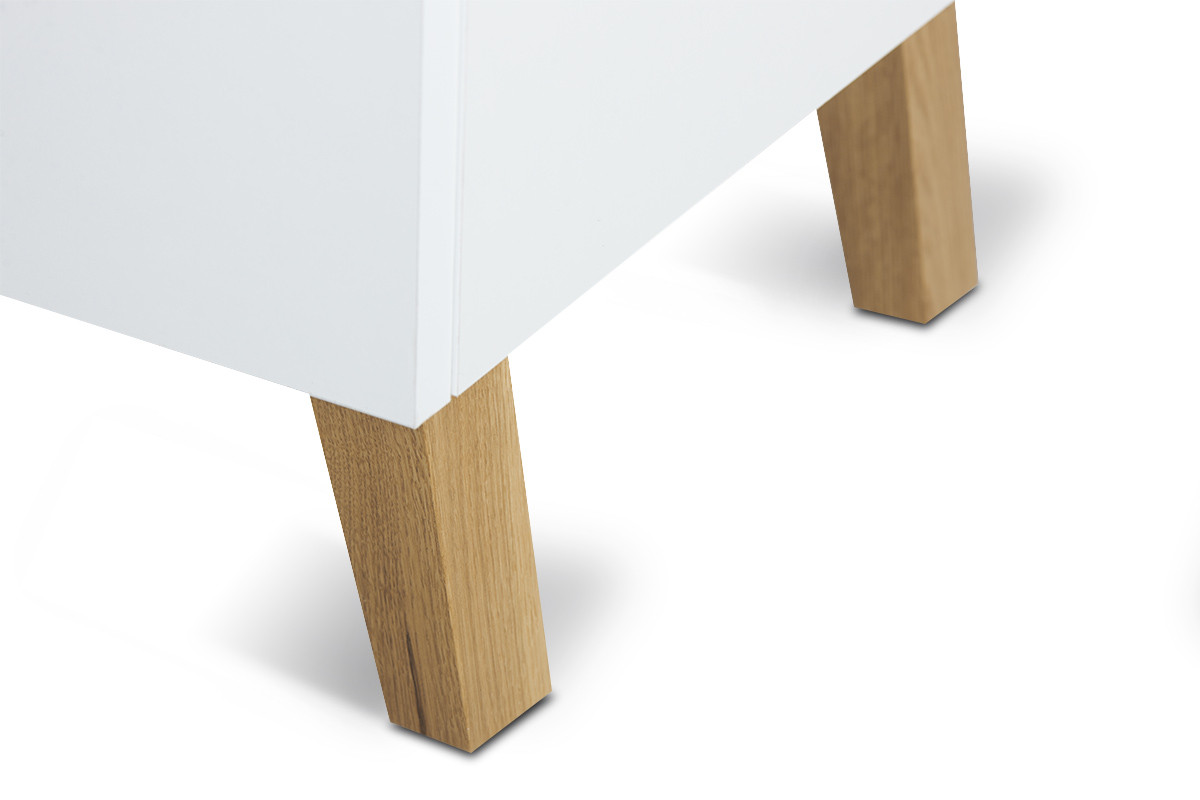 Wykonane z solidnej płyty meble wspierają wytrzymałe nóżki z litego drewna. Stabilność komody FRISK zapewnia specjalne mocowanie tylnej ścianki. Szuflady zostały wyposażone w kulkowe prowadnice hydrauliczne, które gwarantują ergonomię oraz cichą pracę.