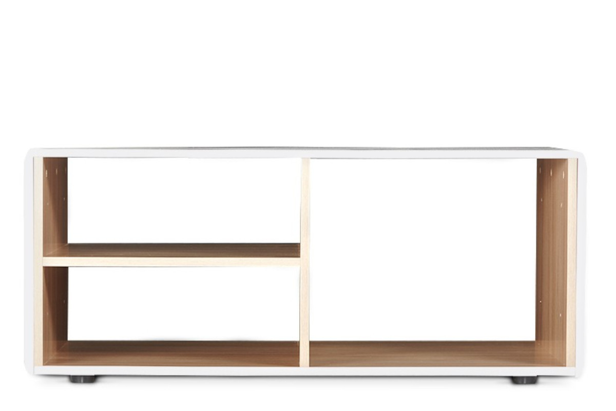 AVERO zobacz całą kolekcję Stolik kawowy z półkami w stylu skandynawskim biały- kolor biały matowy/biały połysk/dąb
