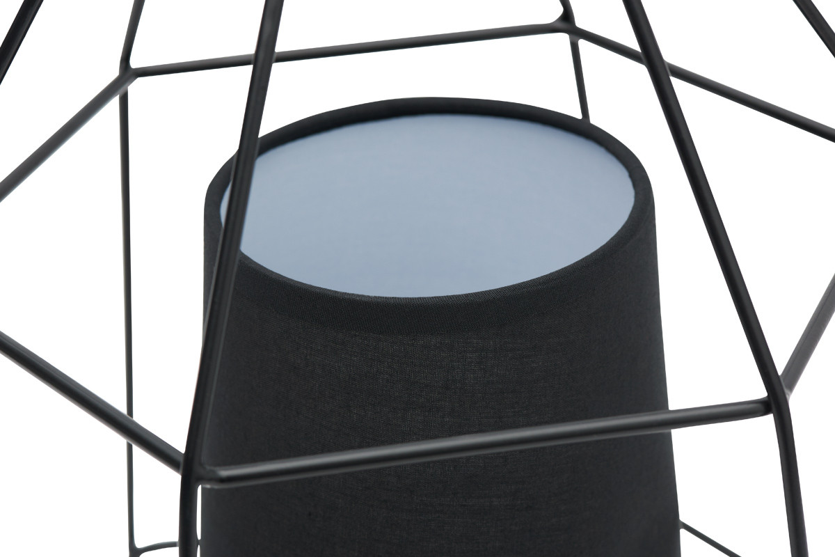 Podstawa lampy wykonana jest z metalu, klosz natomiast z tkaniny.