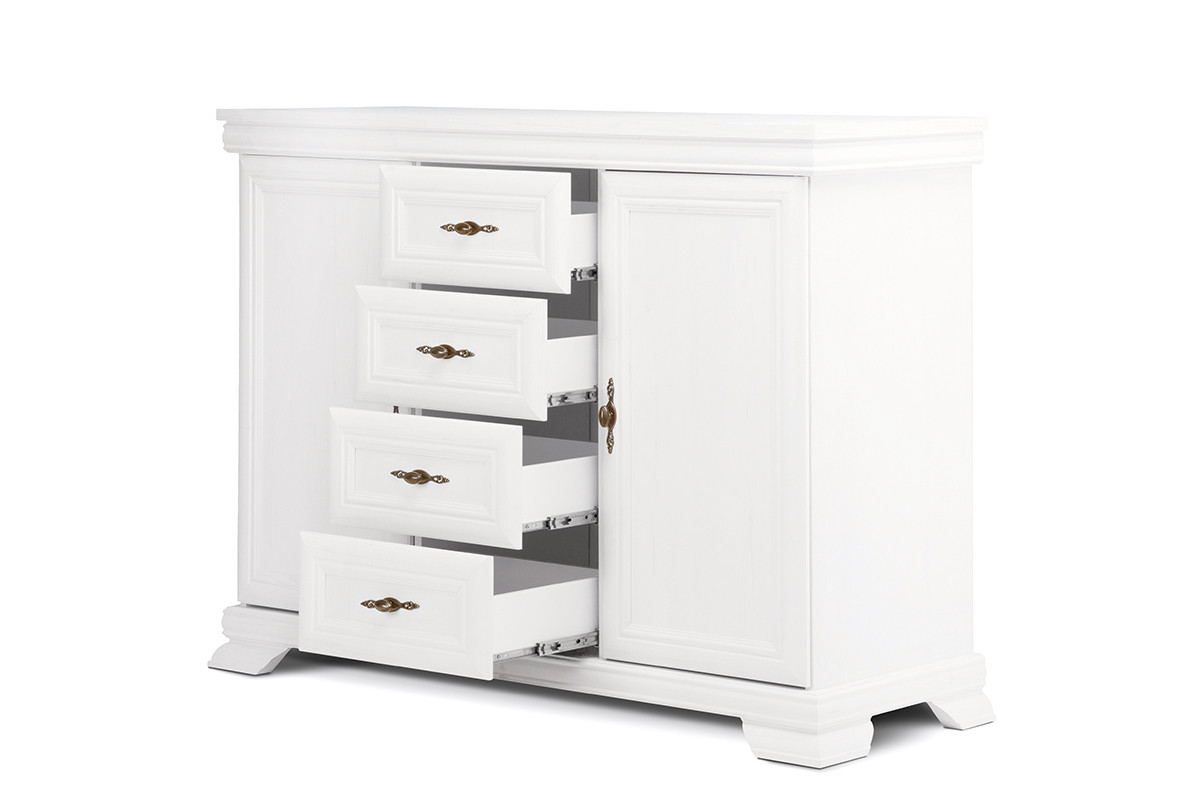 Potrzeba przestrzeni jest wspólna wszystkim ludziom. Niezależnie od tego, czy mamy duże rodziny, czy mieszkamy jako single, miejsce do przechowywania to niezbędny element naszego salonu, sypialni czy pokoju dziennego. Komoda z kolekcji IMPERIO została wyposażona w cztery wygodne szuflady i dwie szafki z półkami, które pomieszczą wszystkie przedmioty codziennego użytku. Wykonana z wytrzymałej płyty okleinowanej folią, wolna jest od wad typowych dla litego drewna.