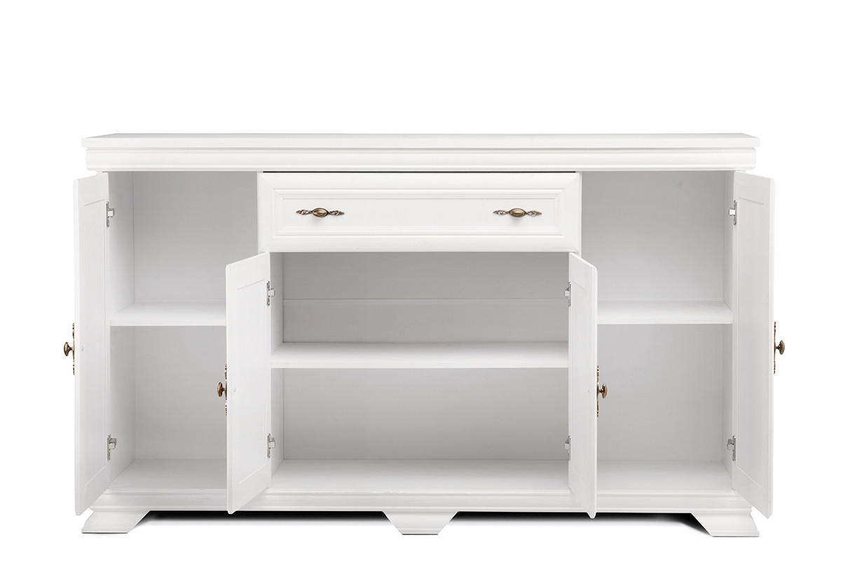 Przestrzeń jest tym, czego potrzebujemy – niezależnie od tego, czy mieszkamy w pojedynkę, czy wraz z liczną rodziną. Zaprojektowana w klasycznym stylu komoda z kolekcji IMPERIO dostarcza mnóstwo miejsca na przechowywanie. Trzy pojemne szafki o różnych wymiarach, z wytrzymałymi półkami, a także praktyczna szuflada wyposażona w rolkowe prowadnice spełnią oczekiwania nawet najbardziej wymagających domowników!