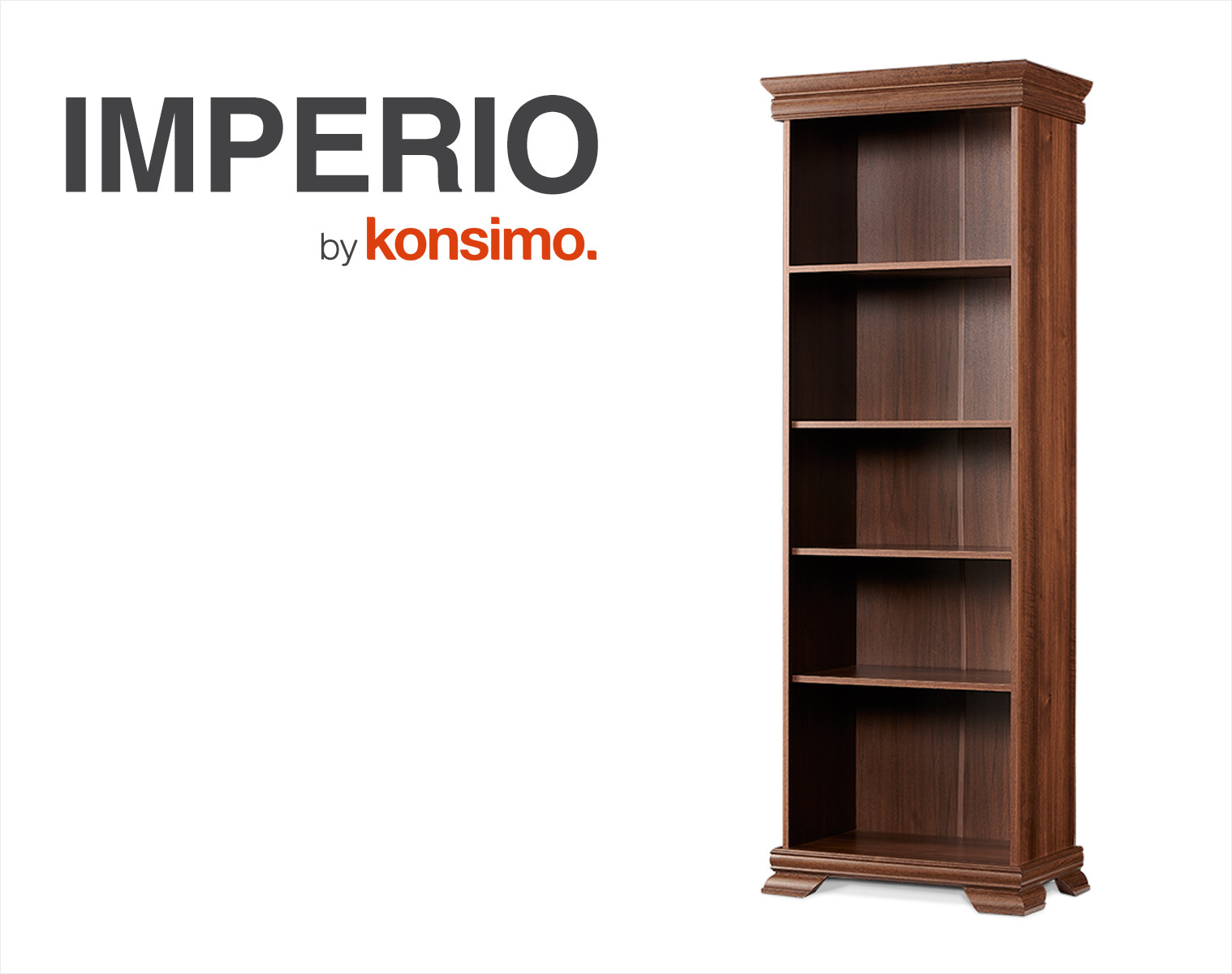 Elegancki wygląd i ponadczasowa estetyka to główne cechy mebli z kolekcji IMPERIO. Regały to sposób na umeblowanie biura i salonu. Otwarte półki dają dużo miejsca do zagospodarowania. Możesz wykorzystać ich powierzchnie jako domową bibliotekę lub jako miejsce do ekspozycji dekoracji. Efektowna okleina naśladująca strukturę i fakturę drewna zapewnia niepowtarzalny wygląd. Przyjemny efekt mebla zawdzięcza ciepłemu, orzechowemu kolorowi. Rzeźbione blaty nadają niepowtarzalnego i ponadczasowego charakteru, co dodatkowo podnosi walory wizualne mebla.