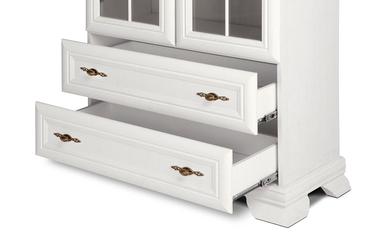 Trudno wyobrazić sobie salon bez stylowej witryny IMPERIO. Utrzymanie dawnego stylu dzięki zastosowaniu obramowanych elewacji i elementów przypominających drewno. Wyjątkowy mebel do salonu ułatwi ekspozycję porcelanowej zastawy stołowej i pamiątek z podróży. Za szklanym frontem znajdziesz trzy pojemne półki, dzięki którym możesz uporządkować przechowywane przedmioty oraz dwie szuflady. Wygodne użytkowanie mebli dzięki zawiasom z miękkim zamknięciem.