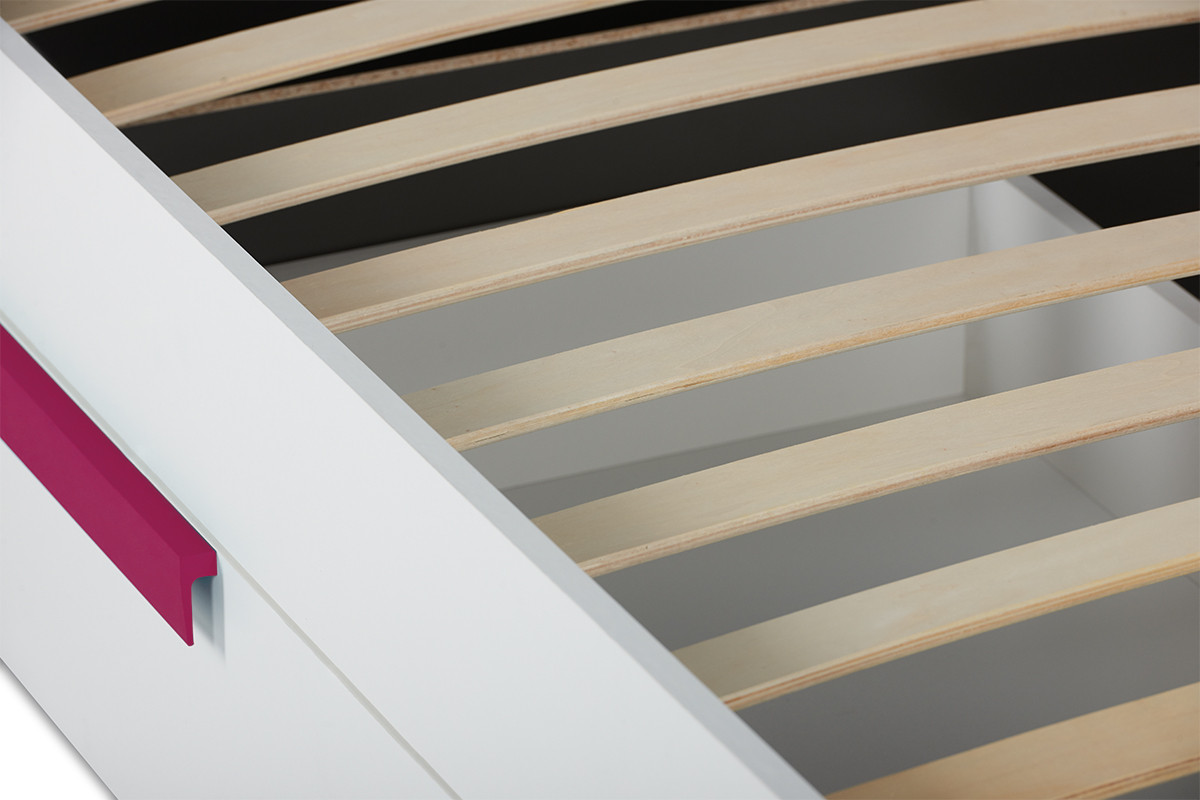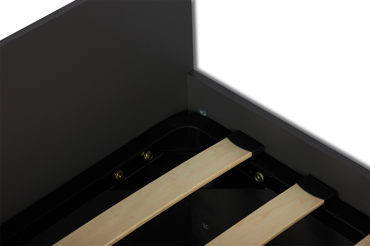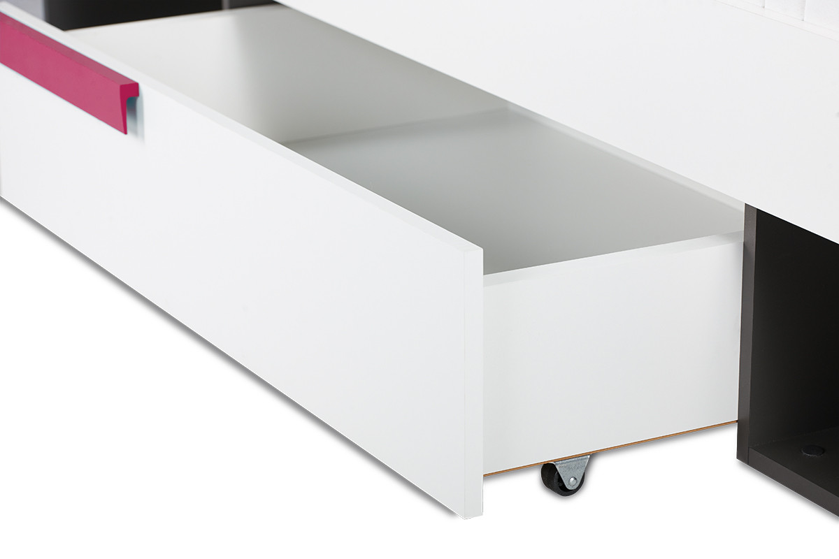 Świetnej jakości drewnopodobny laminat jest dostępny w dwóch wersjach kolorystycznych, a prosta konstrukcja oraz geometryczny uchwyt podkreślają modny i nowoczesny styl łóżka. Pojemne półki i jedna szuflada bez najmniejszego problemu pomieszczą pościele, poduszki oraz inne dziecięce akcesoria, pomagając utrzymać porządek w pokoju naszej pociechy.