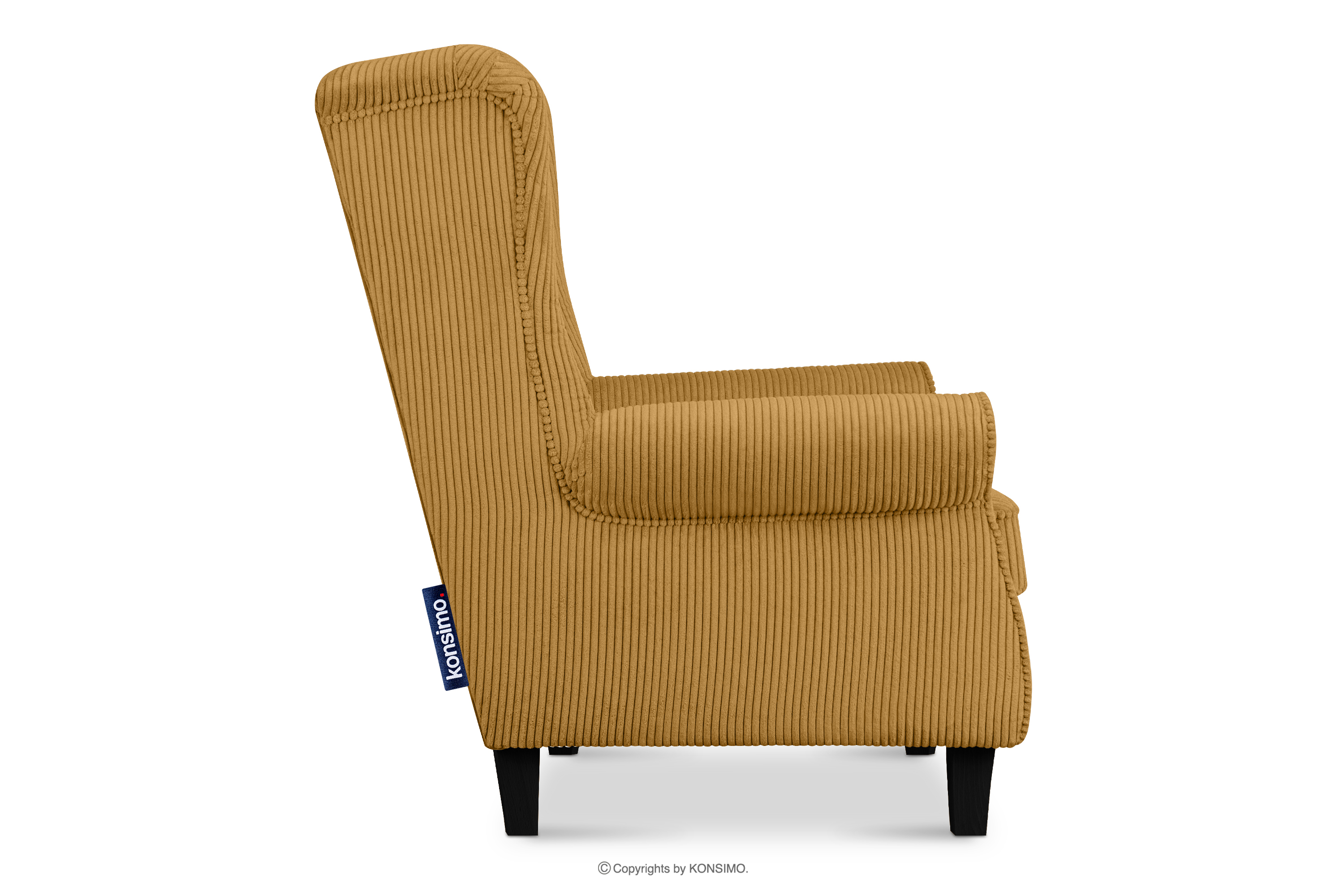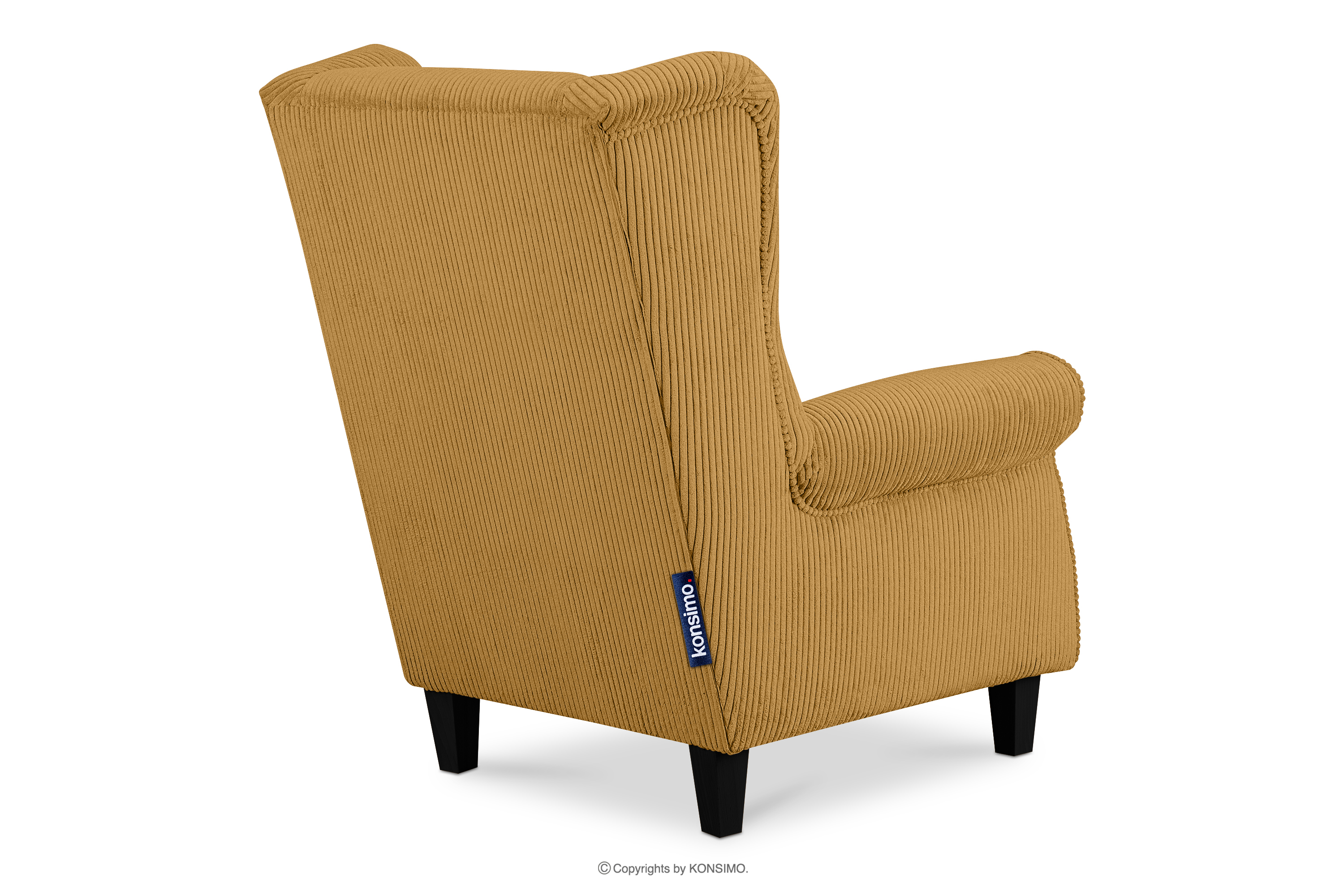 MILES zobacz całą kolekcję Fotel uszak sztruks na drewnianych nóżkach musztardowy/czarny- kolor musztardowy/czarny