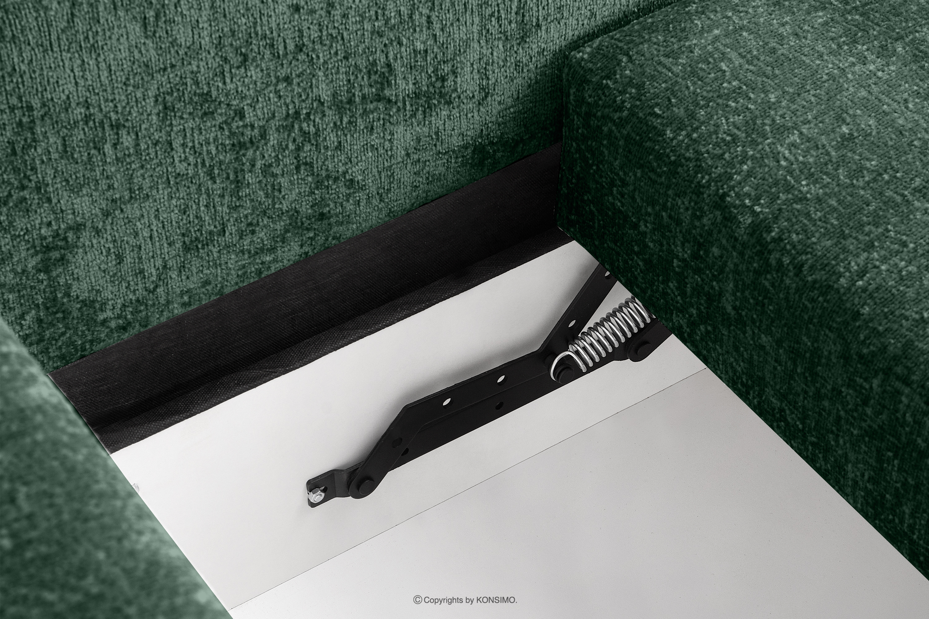 - Materiał stelaża: płyta pilśniowa 3,2mm, wnętrze płyta wiórowa 16mm biała, zewnętrzna część skrzyni otapicerowana tkaniną techniczną