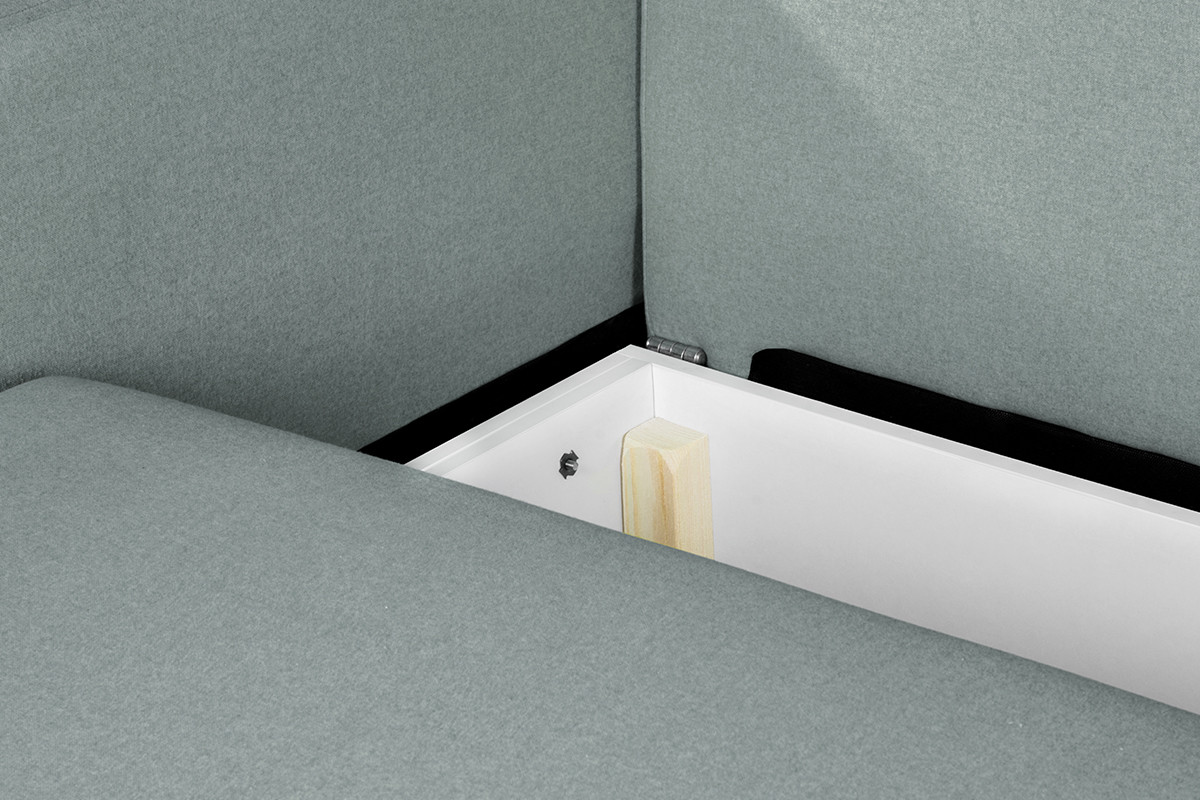 - Stelaż: płyta pilśniowa 3,2mm, wnętrze płyta wiórowa 16mm biała, zewnętrzna część skrzyni otapicerowana tkaniną techniczną