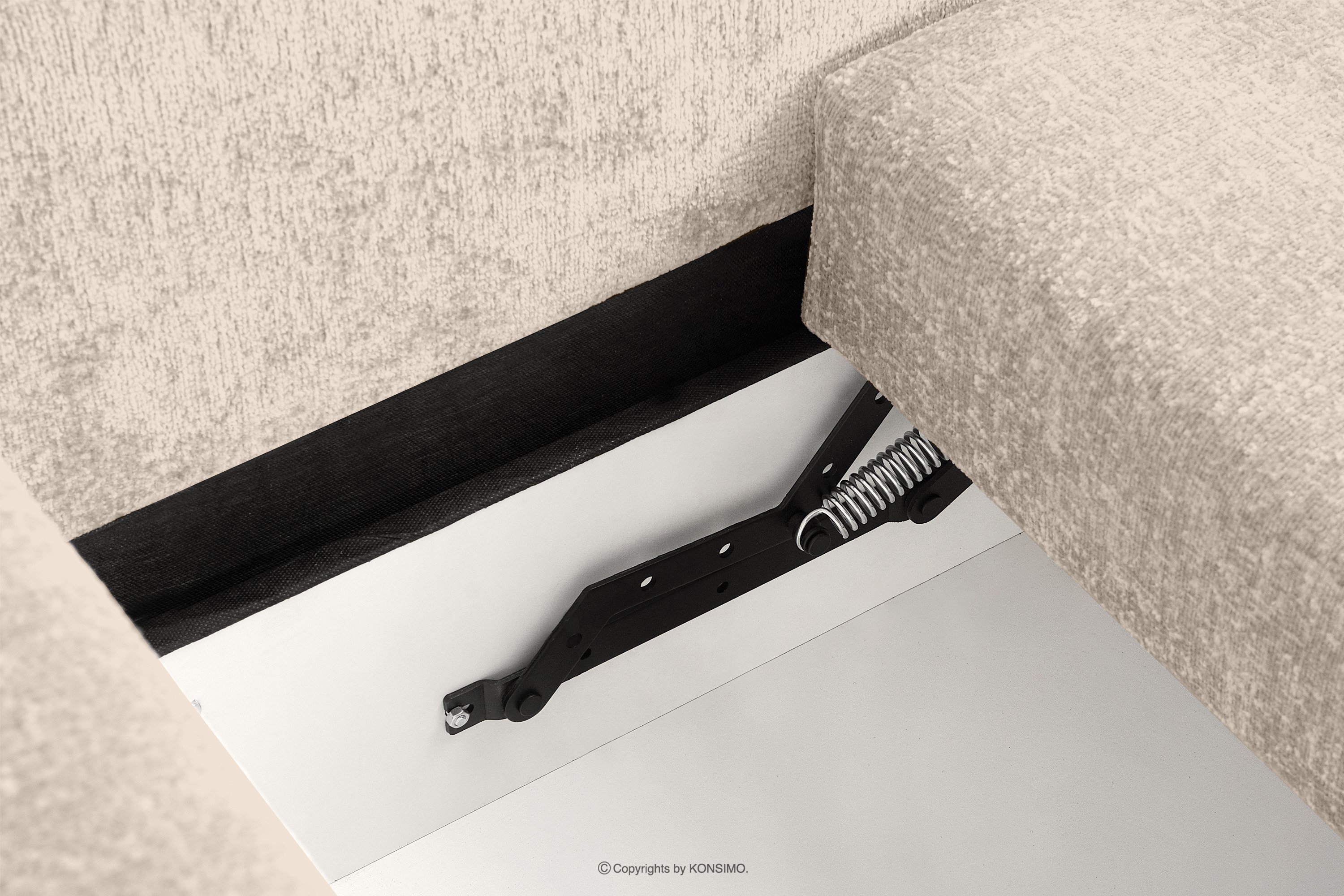 - Materiał stelaża: płyta pilśniowa 3,2mm, wnętrze płyta wiórowa 16mm biała, zewnętrzna część skrzyni otapicerowana tkaniną techniczną