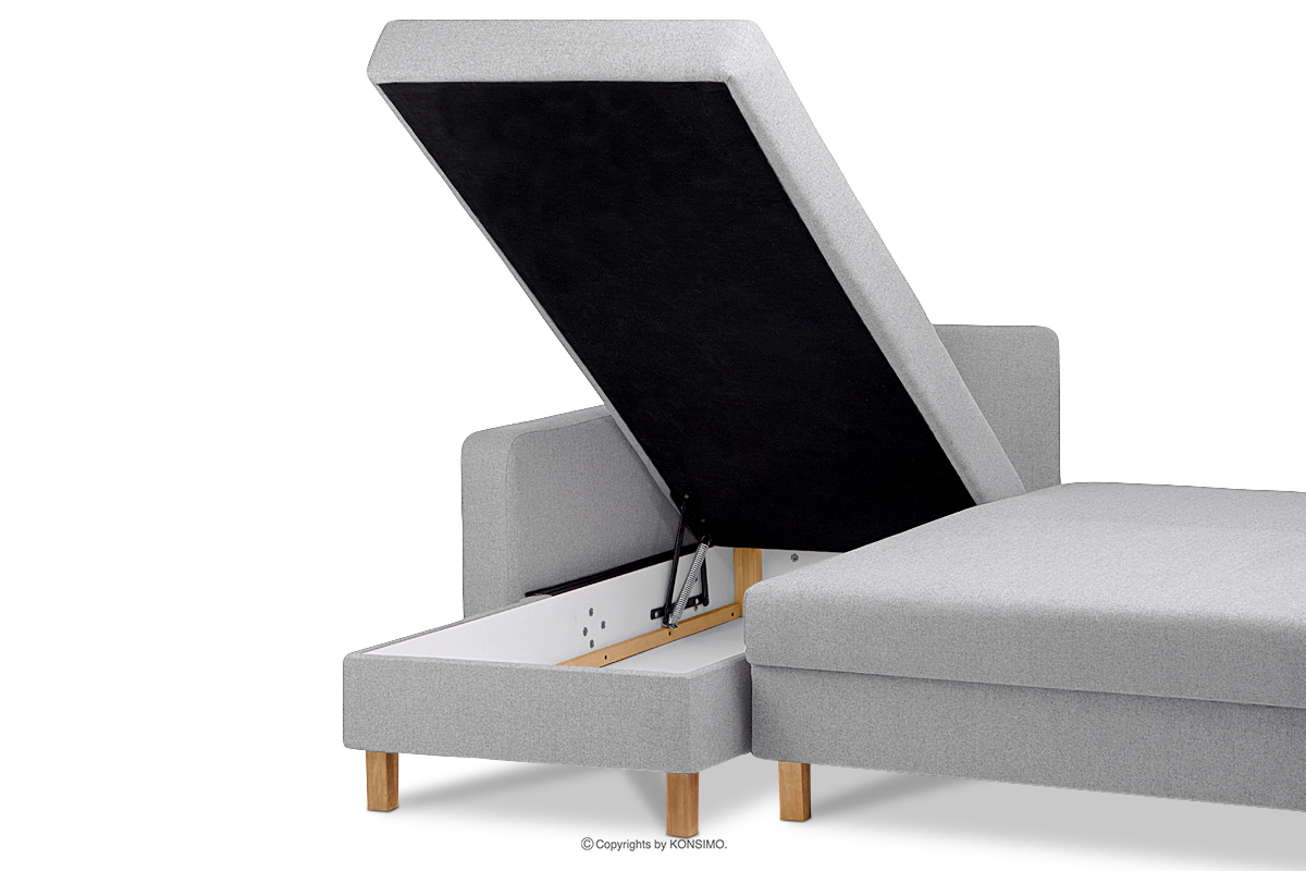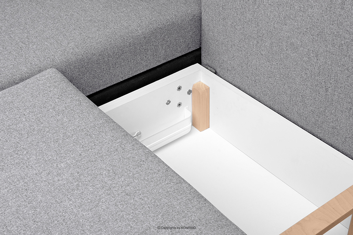 Duży pojemnik na pościel z wywietrznikami pomieści wszystko, co trzeba schować w dzień, a co potrzebne jest w nocy. Wysokiej jakości tkanina pleciona wyróżnia się odpornością na ścieranie i uszkodzenia, a do tego jest łatwa do utrzymania w czystości. Poduszki oparciowe i dekoracyjne posiadają suwaki w tunelach, dzięki którym pokrowce można łatwo zdjąć i uprać. Ten funkcjonalny narożnik skandynawski jest wyjątkowo wygodny i praktyczny – sprawdzi się nie tylko w domu, ale też w hotelu czy poczekalni.