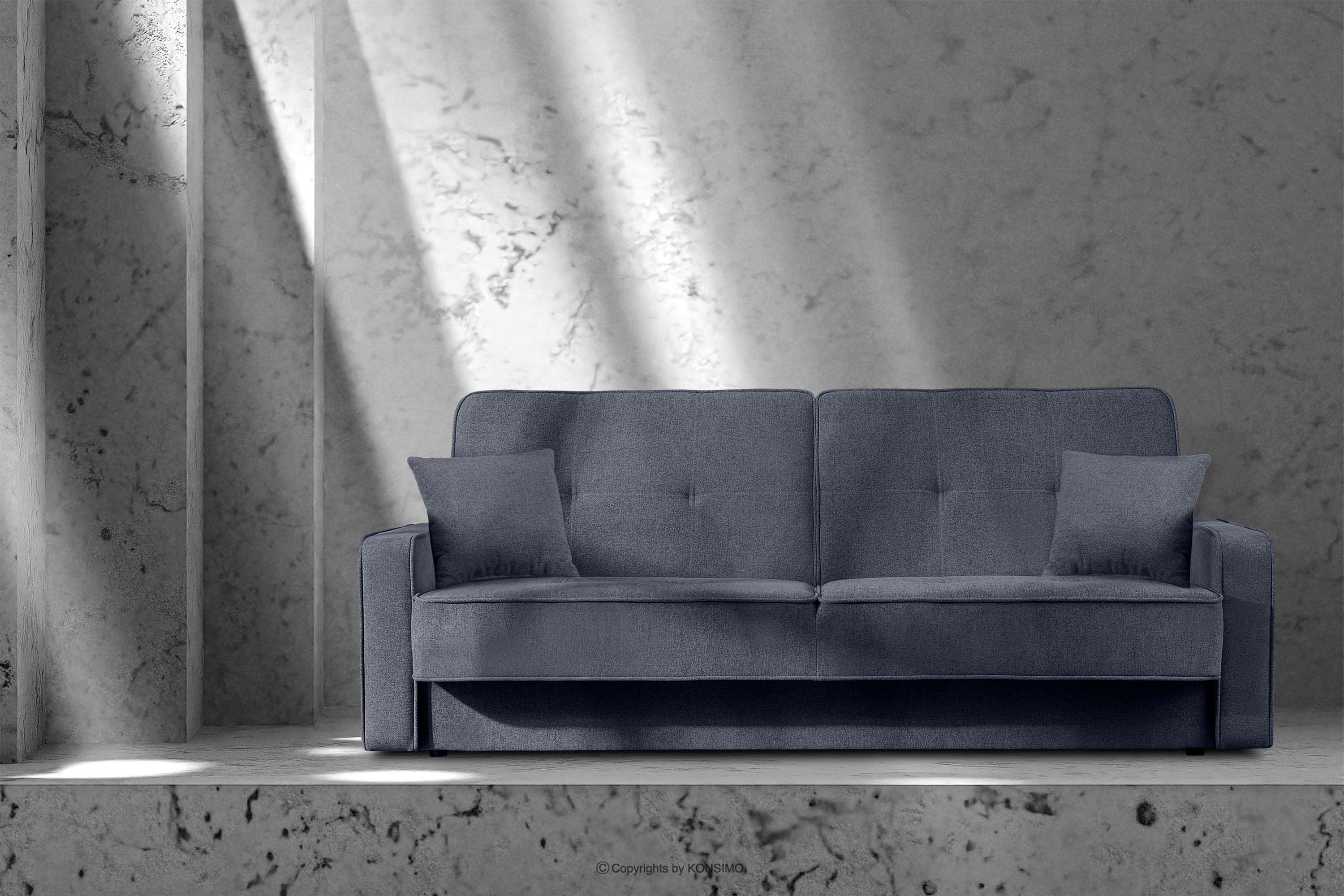 Rozkładana sofa do salonu w tkaninie plecionej granatowa w dzień stanie się funkcjonalną sofą dla całej rodziny, w nocy zaś – dużym i wygodnym łóżkiem. Praktyczny mechanizm funkcji spania – automat wersalkowy – znacznie usprawnia rozkładanie i składanie tej nowoczesnej kanapy. Wyposażona została w przestronny pojemnik na pościel. Wysokiej jakości, przyjemna w dotyku tkanina z ozdobnym pikowaniem jest nie tylko odporna na ścieranie, ale też łatwa do utrzymania w czystości.