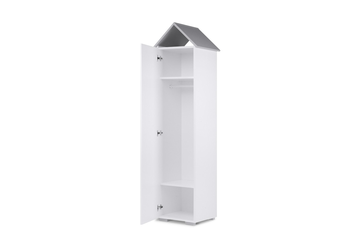Pojemna szafa na ubrania to absolutny must-have w pokoju każdego dziecka. W ofercie Konsimo znajdziesz kolekcję mebli z daszkami PABIS - doskonałe meble dziecięce oraz młodzieżowe. Szafa dla dziecka szara posiada w swoim wnętrzu drążek na wieszaki, dzięki któremu uporządkowanie ubrań twojej pociechy stanie się łatwością. Dodatkowe dwie półki w środku pozwolą Ci uzyskać dodatkową przestrzeń na książki, zabawki oraz inne akcesoria dziecięce.