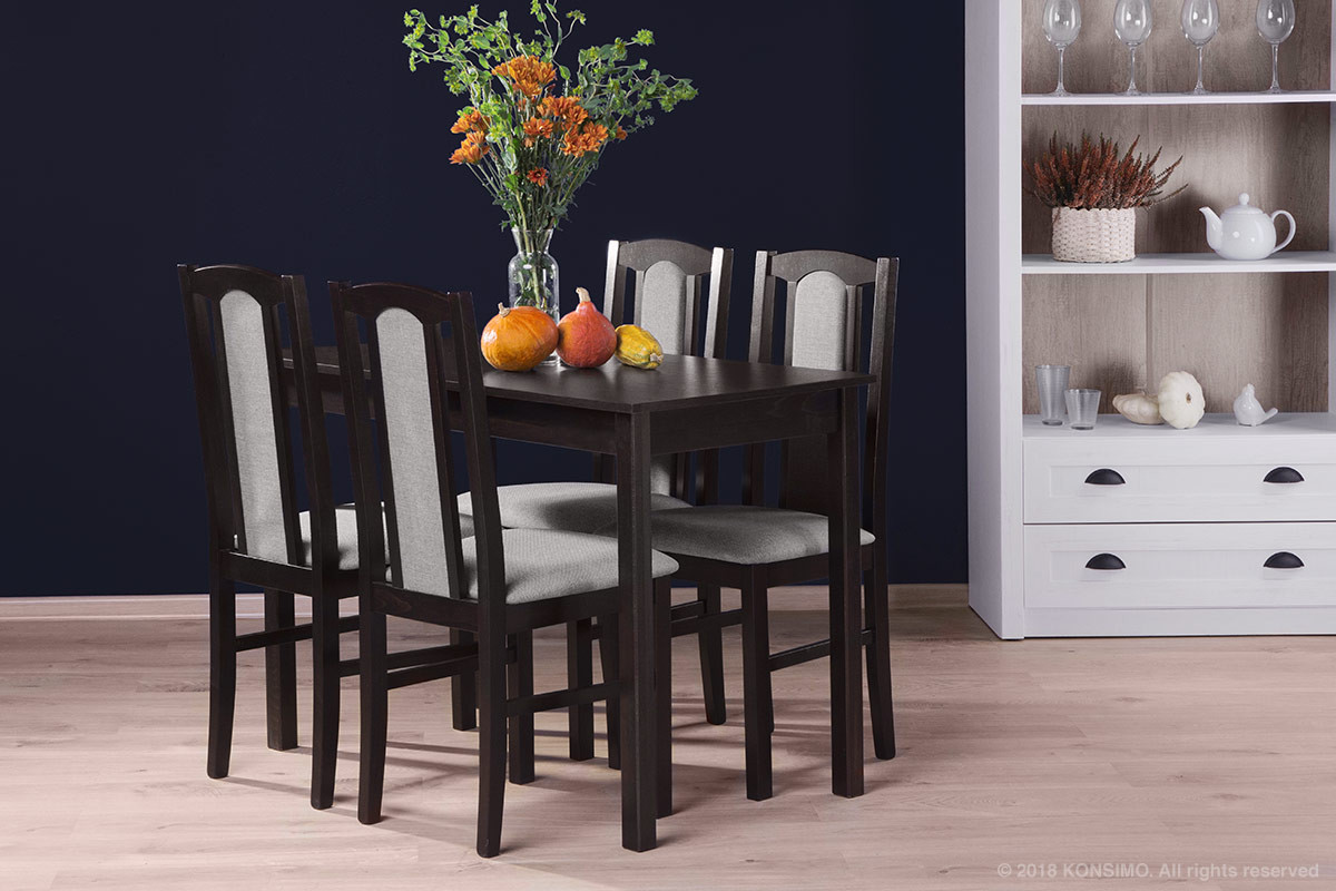 Nowoczesny stół z kolekcji EVENI, jest doskonałą propozycją zarówno do klasycznego salonu, jadalni czy kuchni. Nogi i stelaż zostały wykonane z litego drewna bukowego, dzięki czemu cała konstrukcja jest wyjątkowo stabilna i trwała. Natomiast blat stołu tworzy 16 mm laminowana płyta wiórowa.