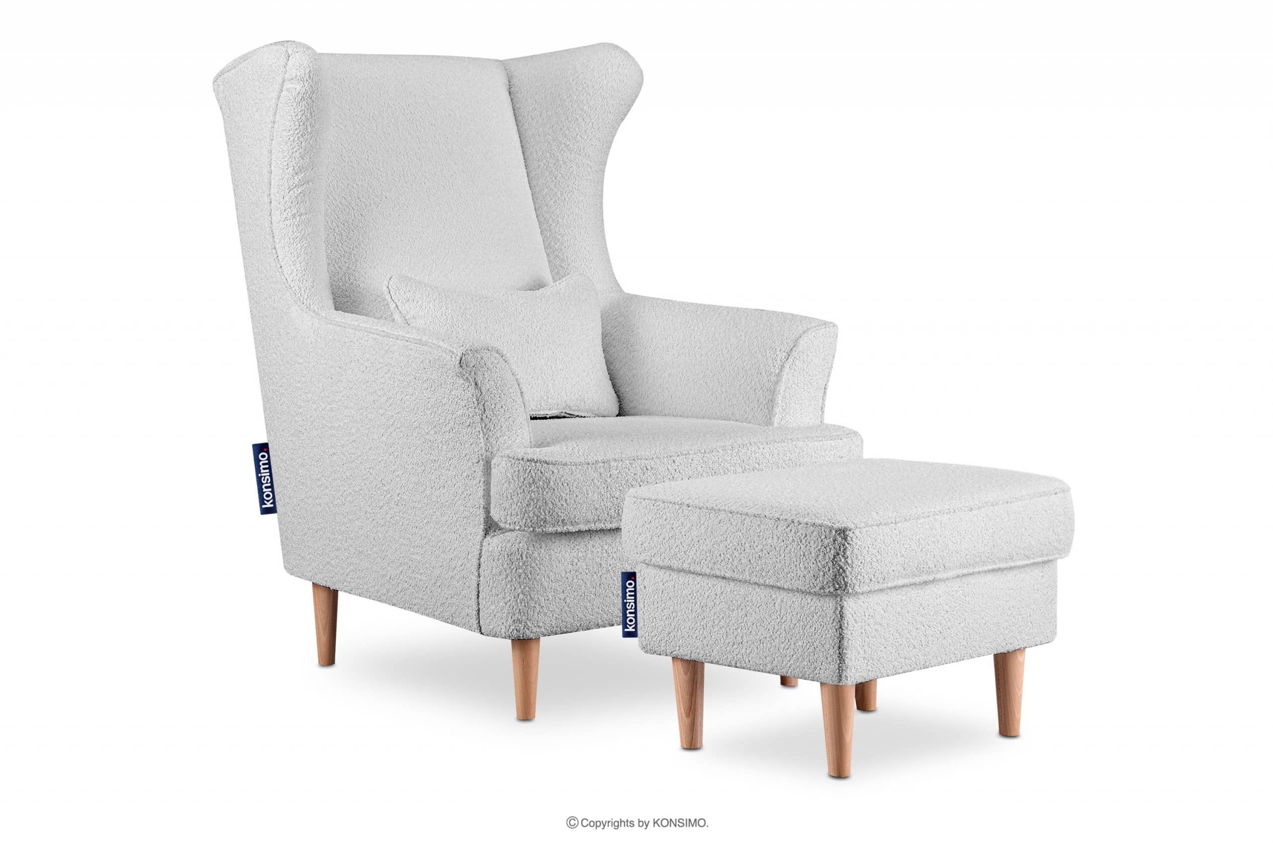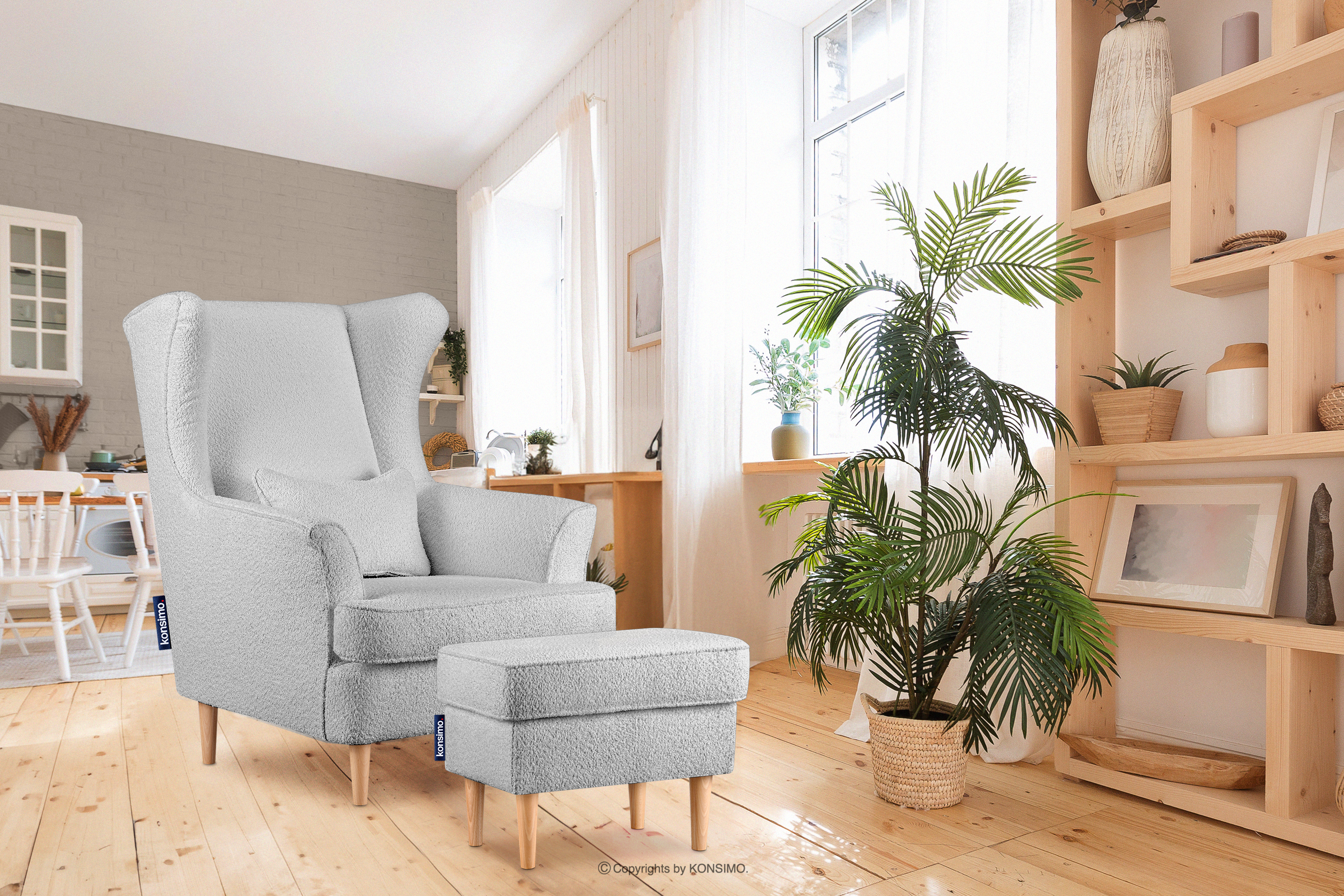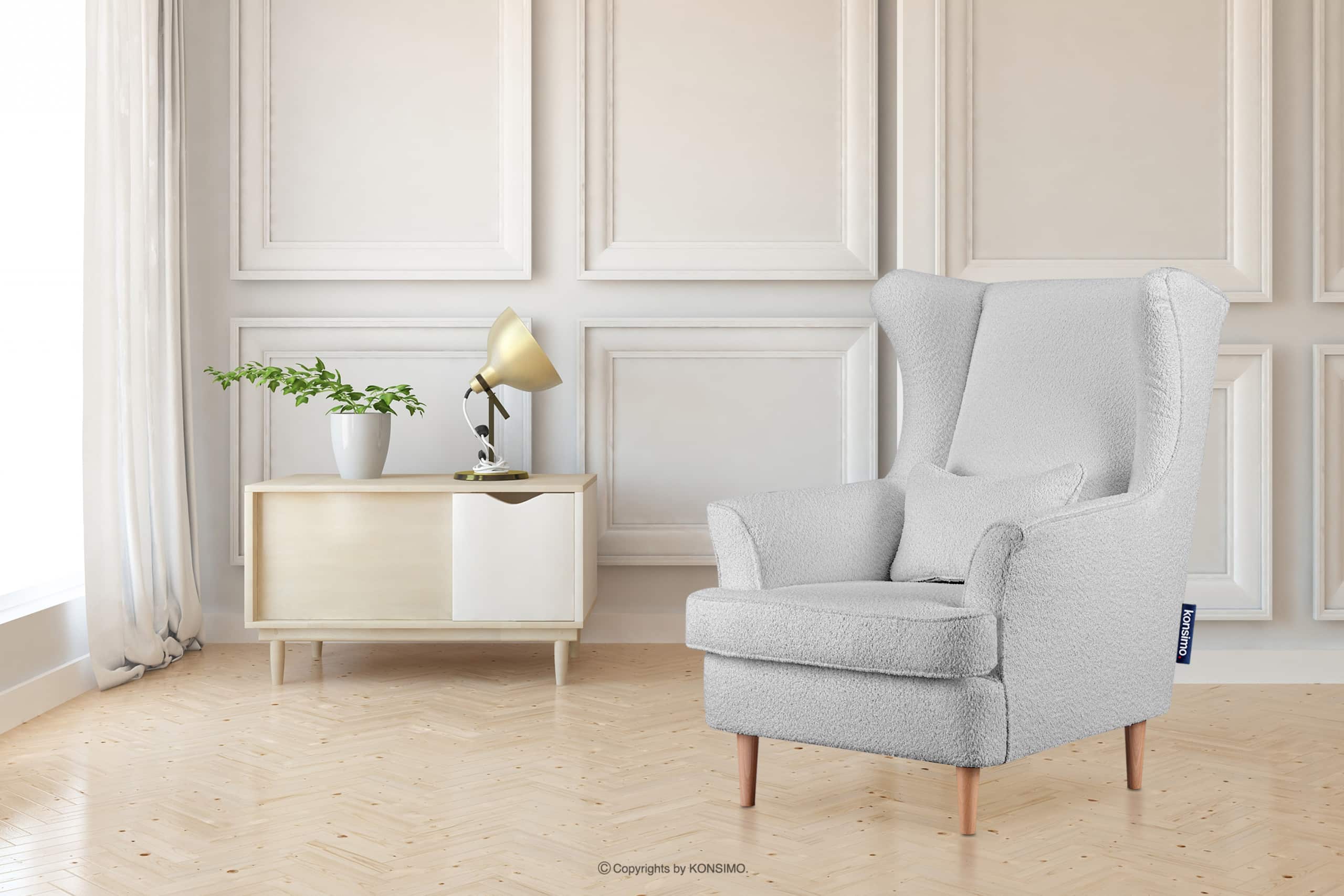 STRALIS zobacz całą kolekcję Wygodny fotel uszak jasny szary w tkaninie boucle- kolor jasny szary