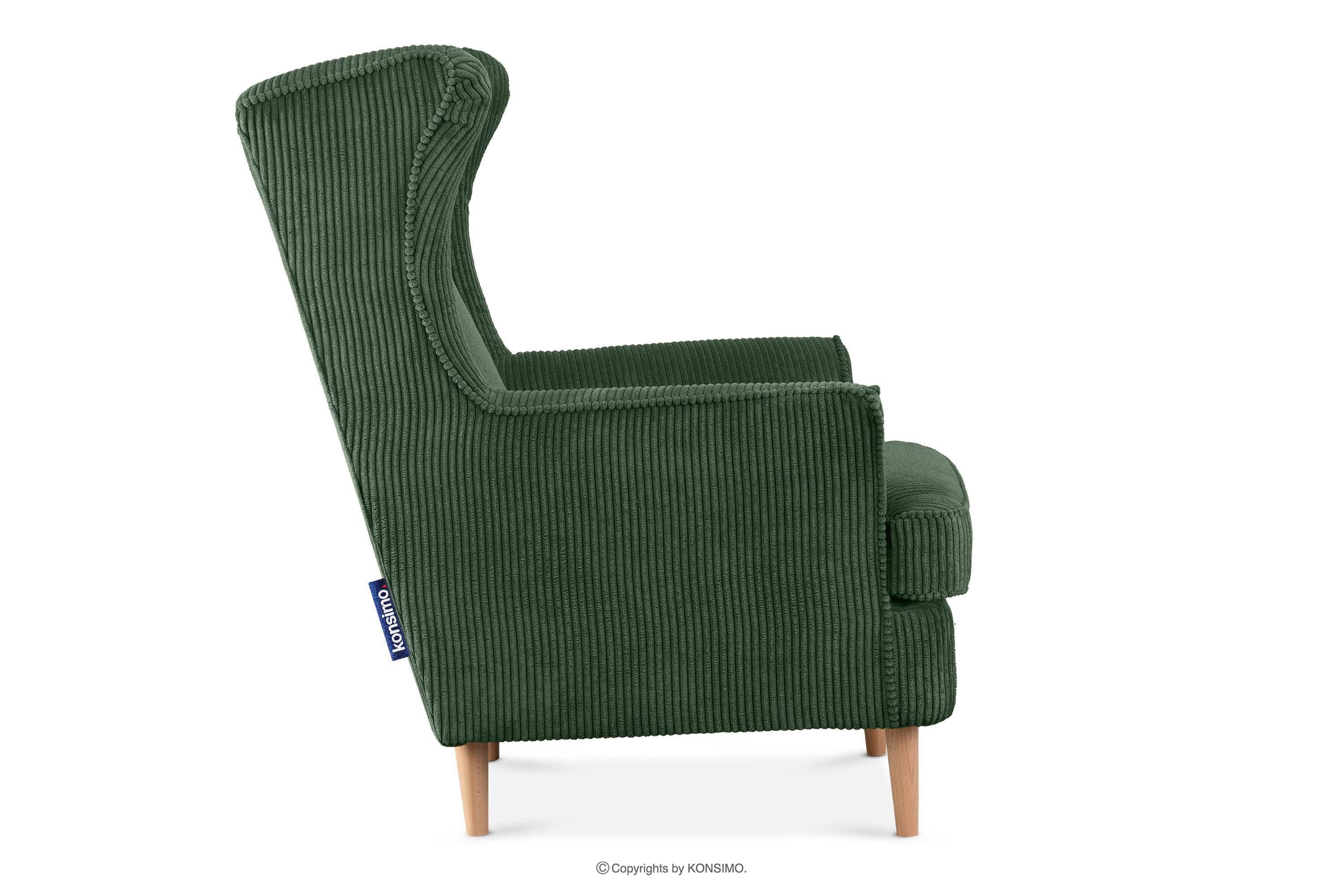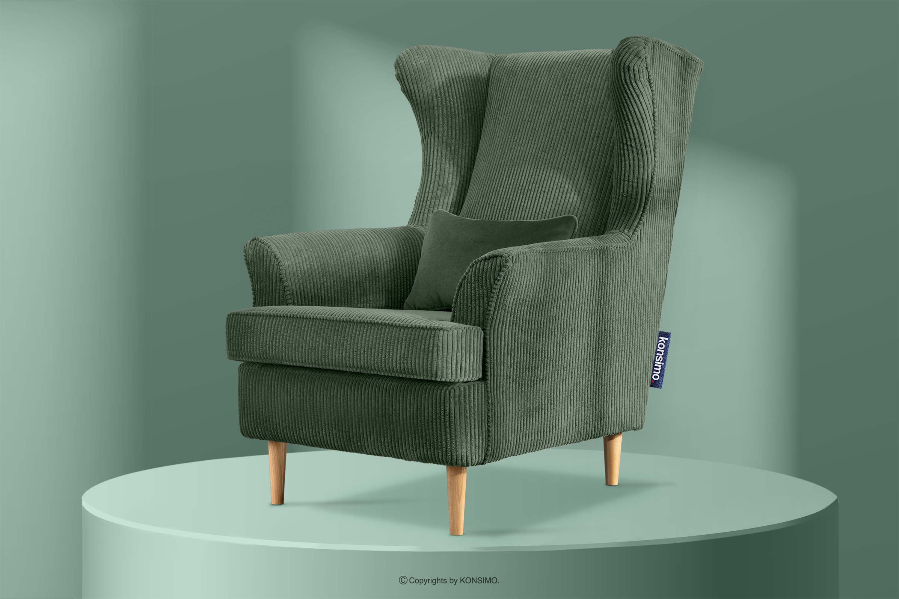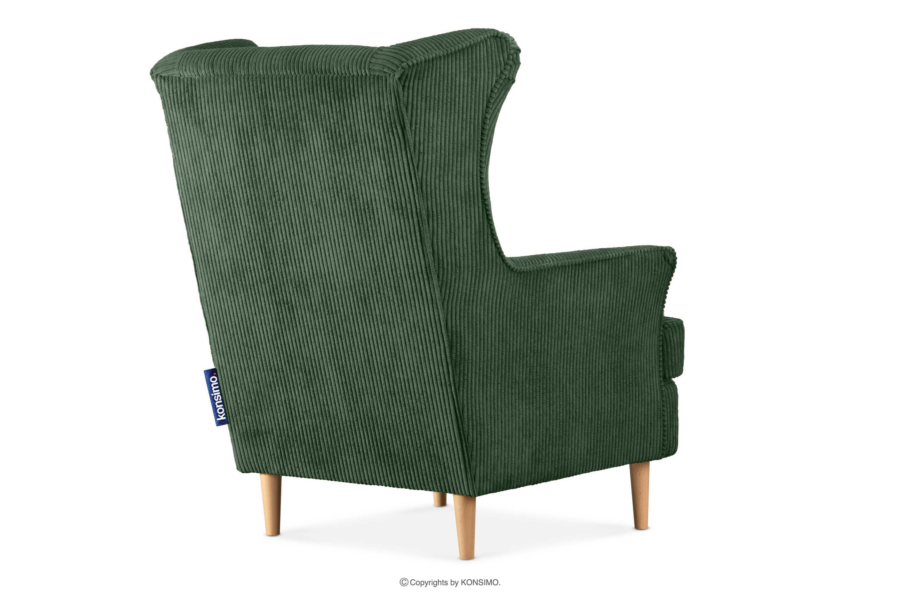 STRALIS zobacz całą kolekcję Fotel uszak w tkaninie sztruks z poduszką welur ciemny zielony- kolor ciemny zielony