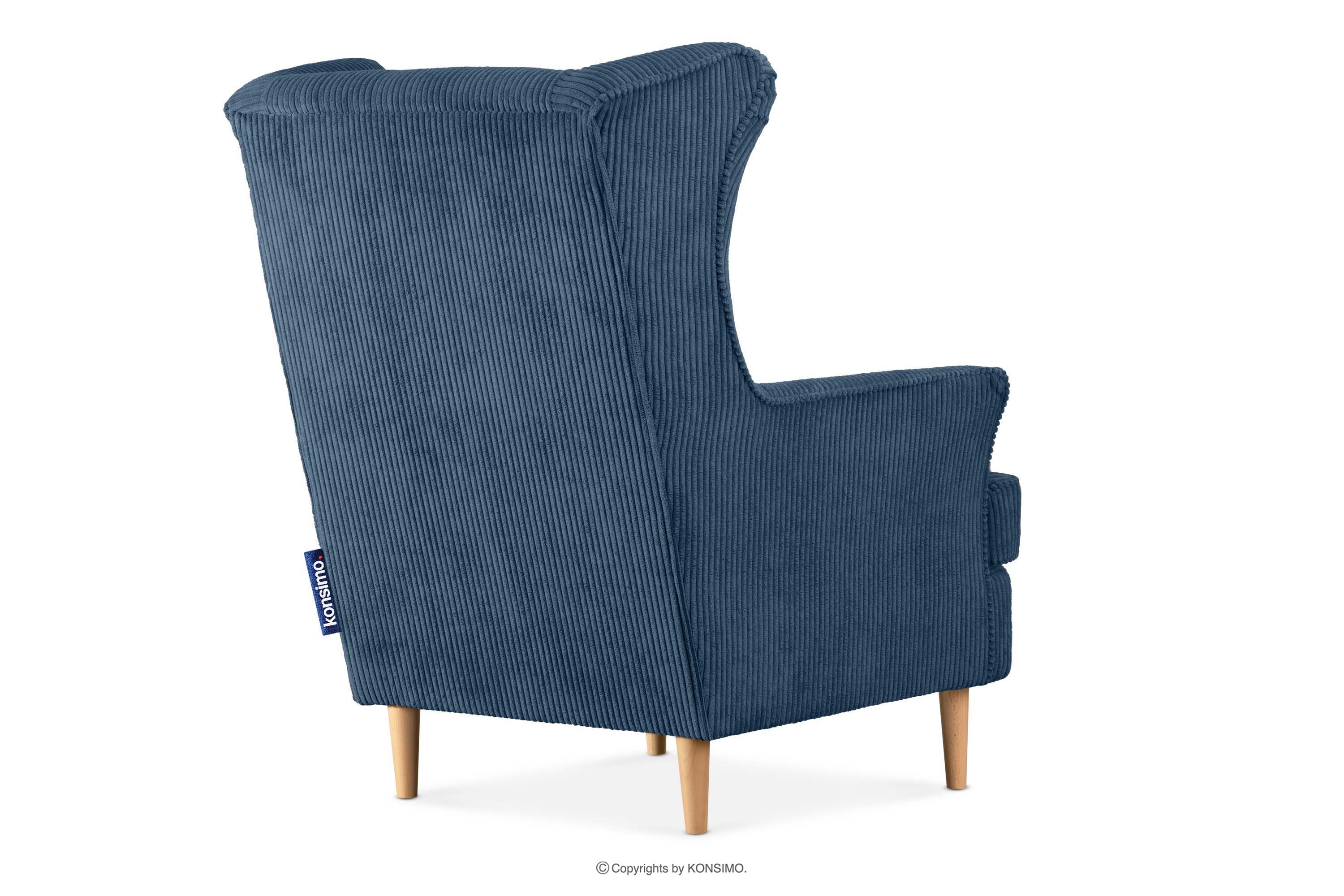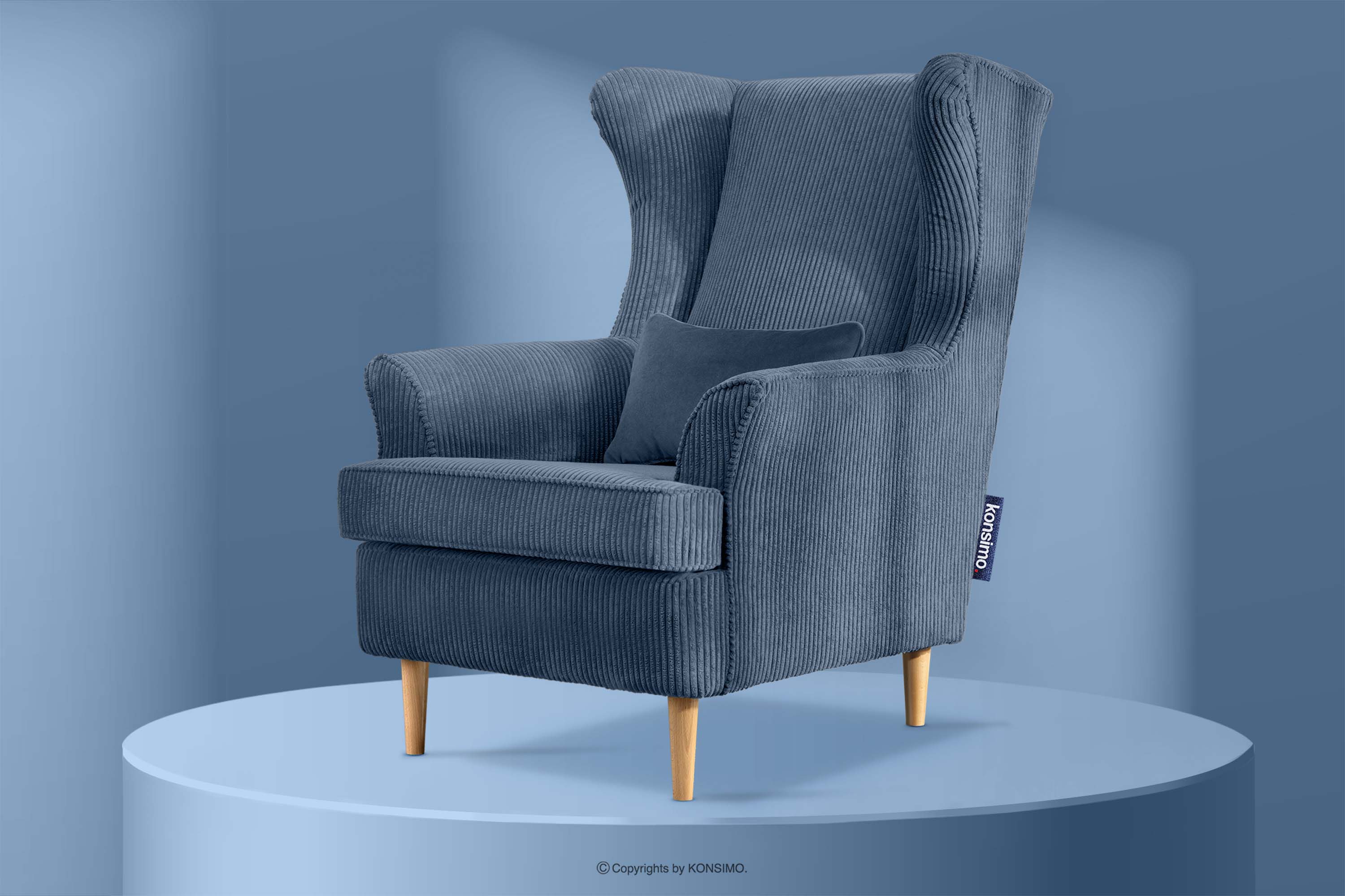 STRALIS zobacz całą kolekcję Fotel uszak w tkaninie sztruks z poduszką welur ciemny niebieski- kolor ciemny niebieski