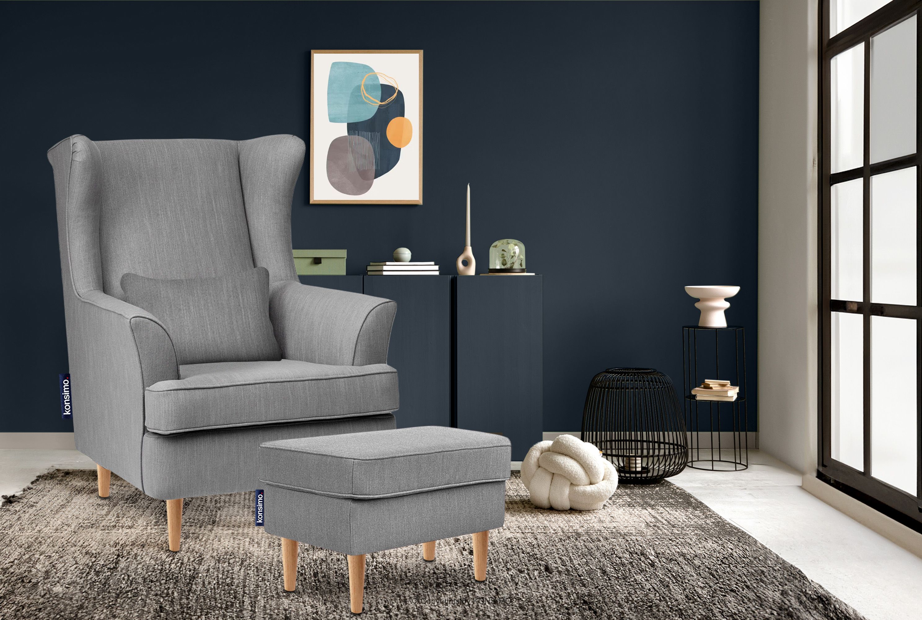 Fotel i puf na drewnianych nóżkach szary/ciemny szary wprowadzi niezwykły klimat w salonie czy sypialni. Wyjątkowa barwa, miękkie linie i elementy z litego drewna doskonale się razem prezentują. Pasuje do klasycznych aranżacji oraz skandynawskich. Świetnie sprawdzi się jako punkt centralny salonu, w wyróżniającym się kolorze. Dodatkowo jego średnio twarde siedzisko oraz optymalnie wyprofilowane, miękkie oparcie i boczki to gwarancja relaksu i doskonałego wypoczynku każdego dnia.