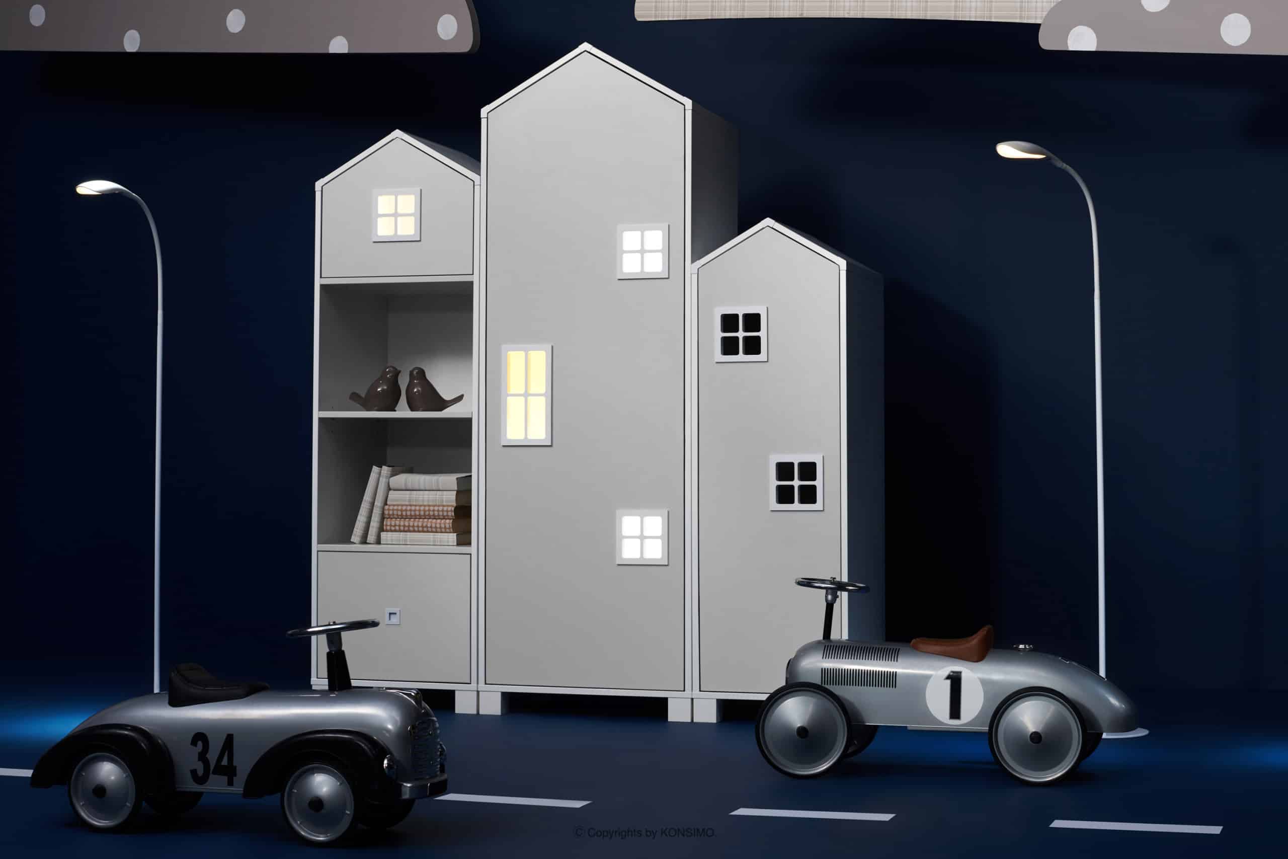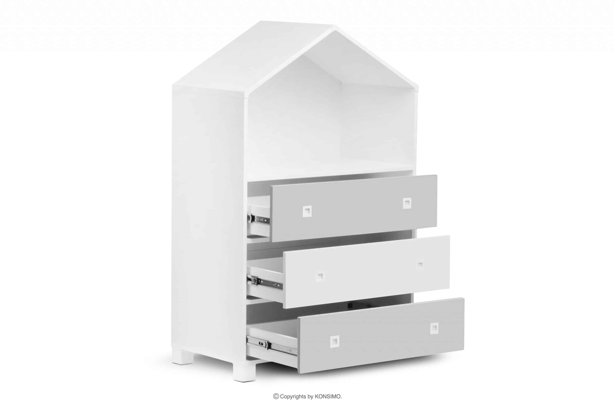 Bajkowa uliczka domków we własnym pokoju – to marzenie każdego dziecka! Wygodnie otwierane szuflady zamiast uchwytów posiadają malutkie okienka. Dwustronnie kolorowa płyta sprawia, iż komoda z daszkiem ładnie wygląda zarówno na zewnątrz, jak i w środku. Tak urządzone, magiczne wnętrze dziecięcego pokoiku tworzy doskonałe warunki do zabawy, nauki i odpoczynku! Co najważniejsze, dziecko poczuje się jak w prawdziwym, bajkowym świecie.