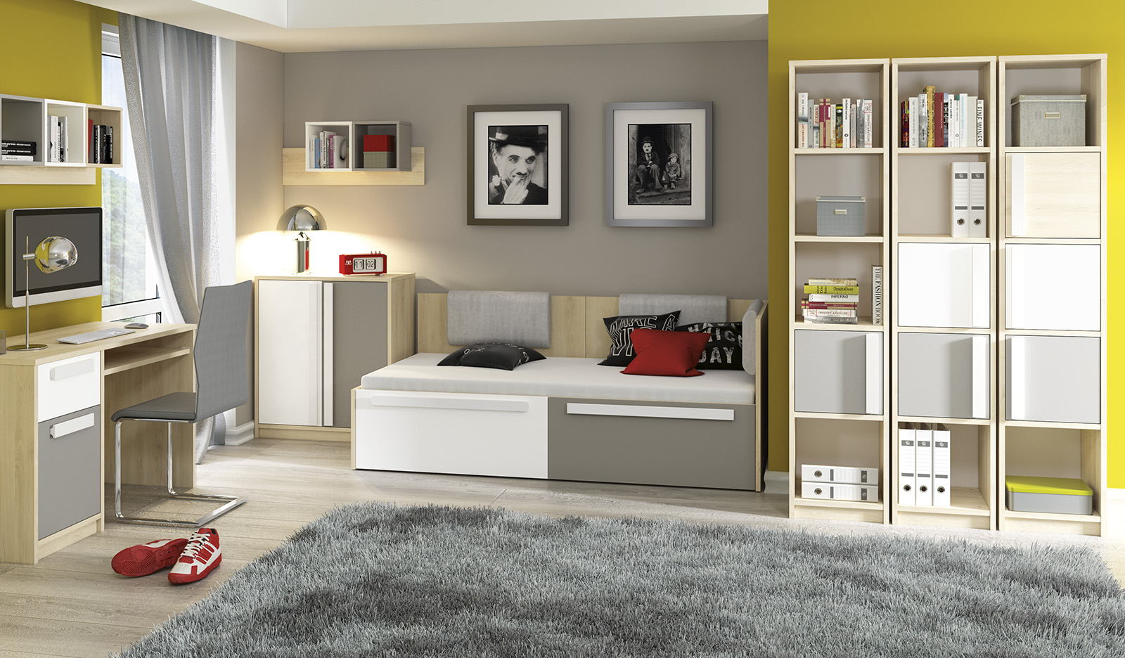 PONGO zobacz całą kolekcję Łóżko ze stelażem i szufladami do pokoju dziecięcego biały / szary / buk- kolor buk/biały/ciemny szary