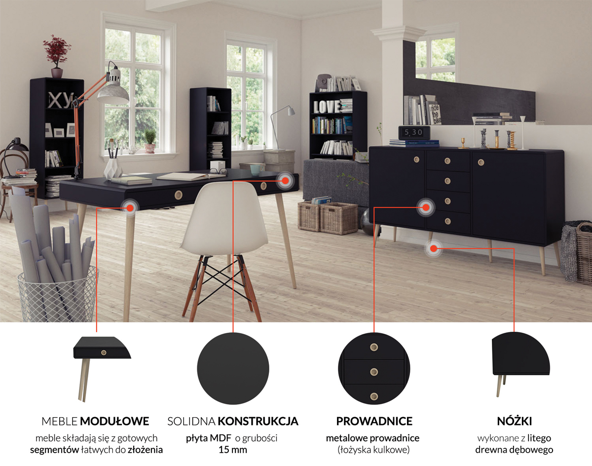 To praktyczne biurko jest niewielkich rozmiarów i świetnie sprawdzi się w niedużych pokojach, jest dobre nie tylko dla uczniów i studentów, ale również dorosłych, którzy potrzebują biurka na co dzień. Biurko w stylu skandynawskim to piękny mebel, dostępny w trzech kolorach, białym, czarnym i szarym, wykończone nogami i uchwytami z litego drewna dębowego.