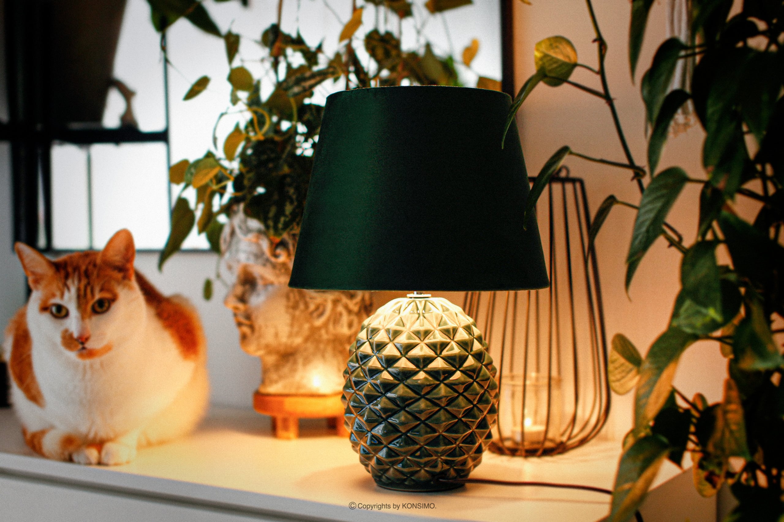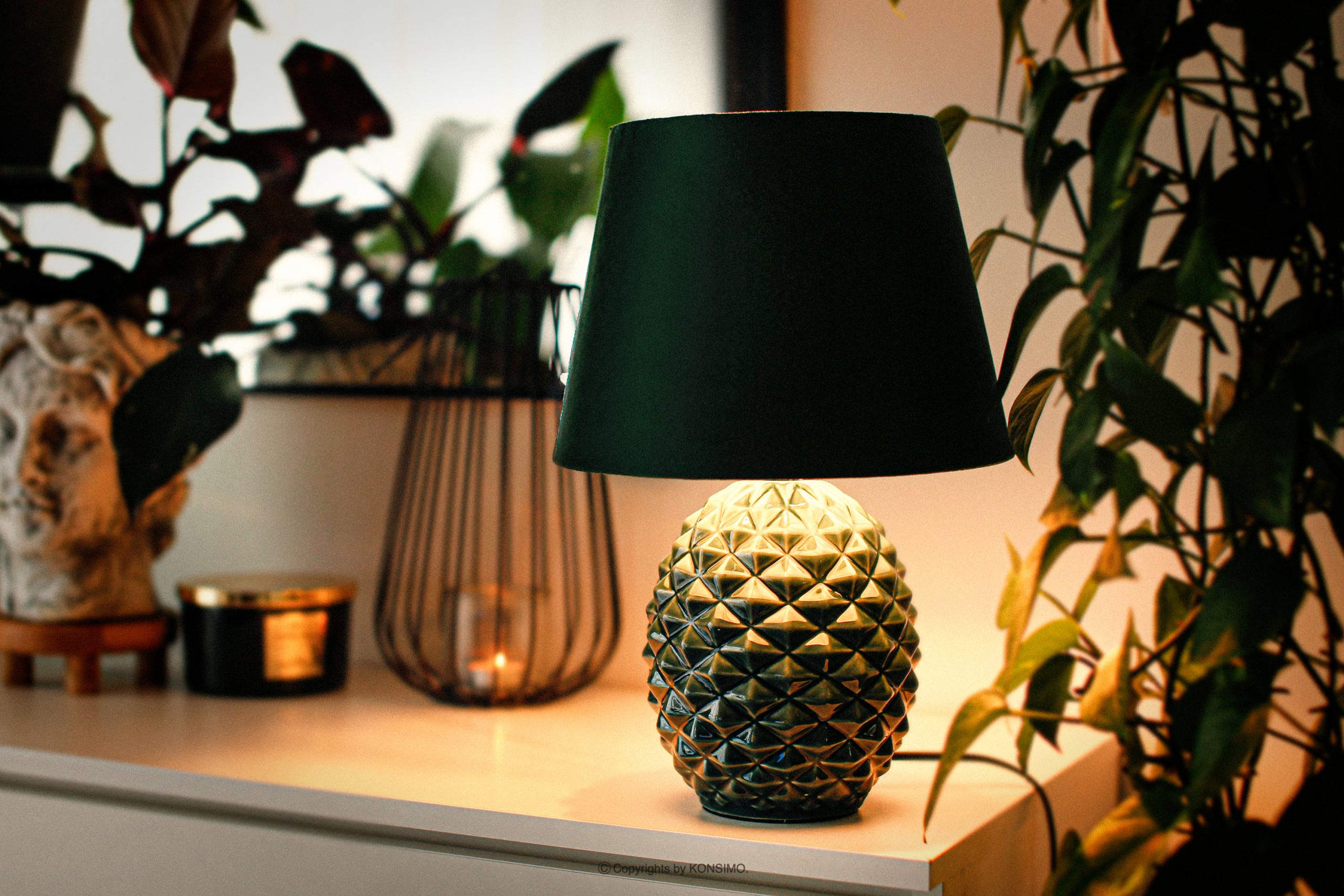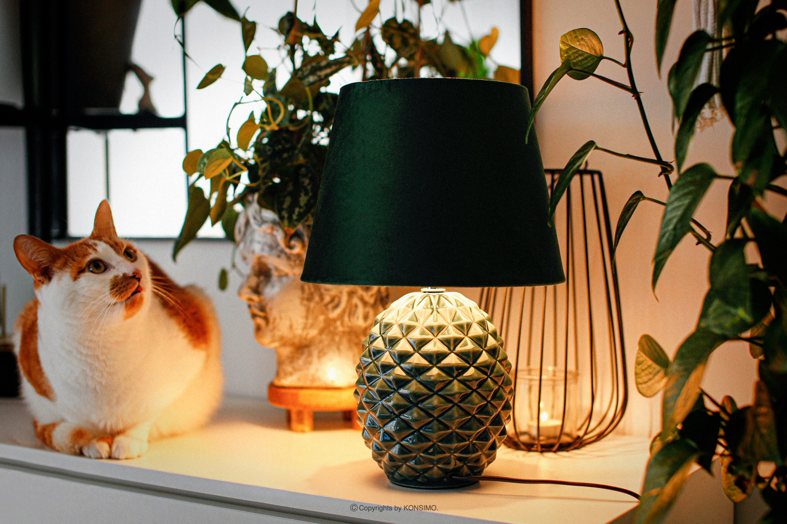 Zielona lampa stołowa to elegancki i stylowy dodatek do wystroju wnętrza. Lampa stołowa FRUCTU posiada ozdobną podstawę wykonaną z ceramiki. Jest bardzo elegancka i pięknie ozdobi przestrzeń w salonie, sypialni, czy na korytarzu. Kolor butelkowej zieleni dopasuje się do wielu wnętrz, np. w stylu nowoczesnym, loftowym i eleganckim.