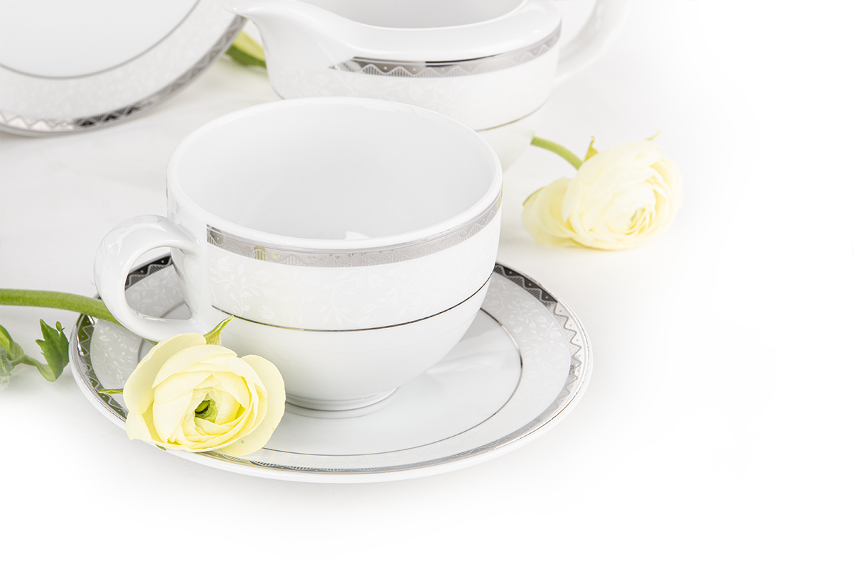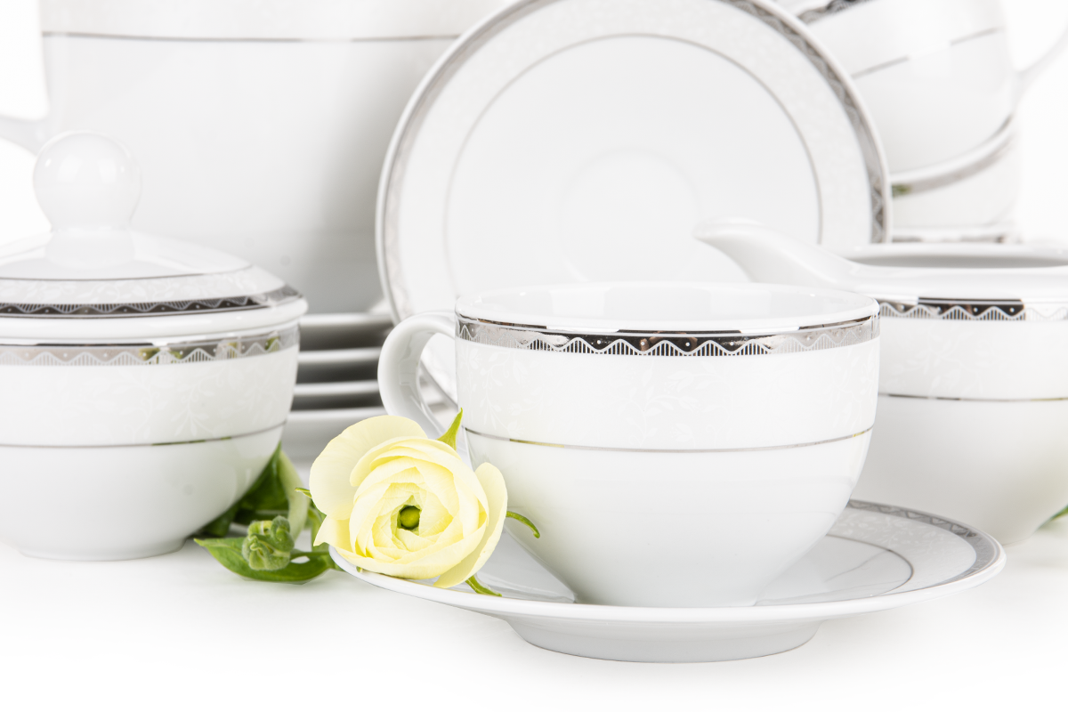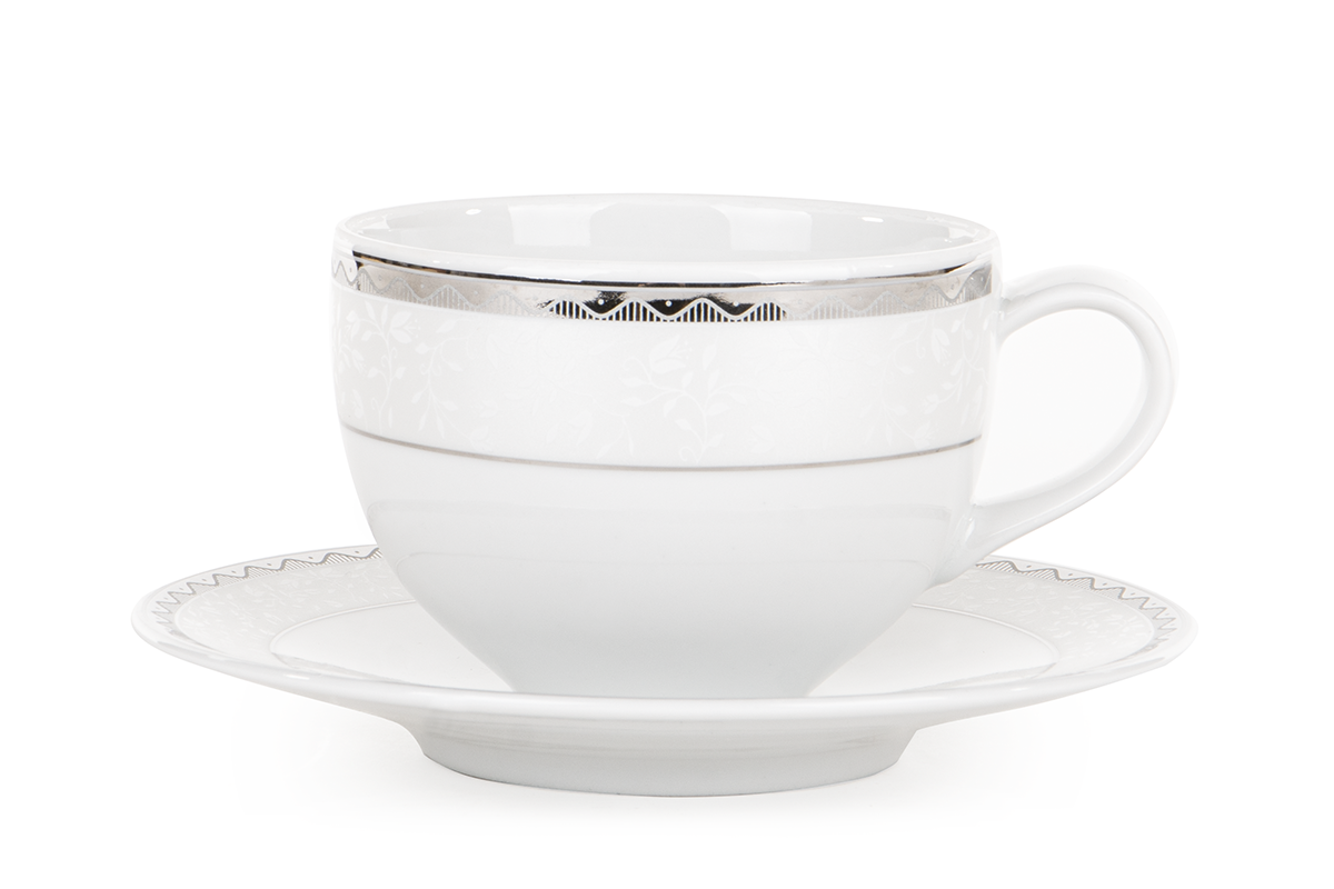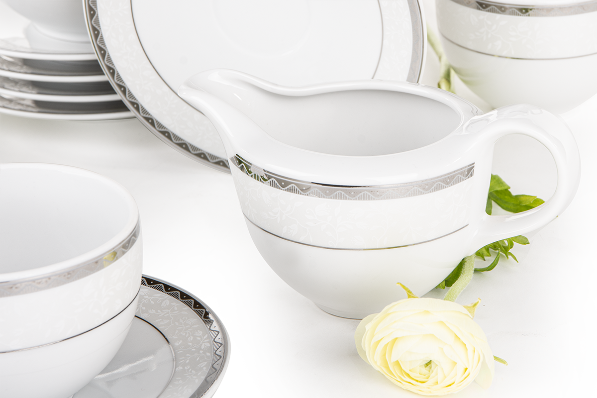 AMELIA PLATYNA Zestaw kawowy porcelana 9 elementów biały / platynowy wzór dla 6 os.
