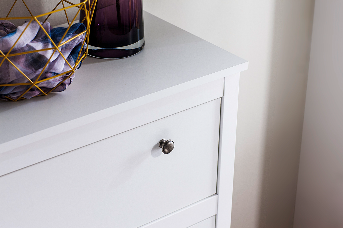 Komoda do sypialni powinna mieścić w swoim wnętrzu najpotrzebniejsze rzeczy codziennego użytku. Pionowa szafka Farge sprawdza się w tej roli znakomicie. Mebel został podzielony na dwie części - mniejszą wyposażoną w trzy wysuwane szuflady oraz szerszą z sześcioma półkami o zamykanych frontach. Biała komoda na nóżkach została wyposażona w kulkowe uchwyty w stylu vintage tworząc elegancką, ponadczasową propozycję do wielu rozmaitych wnętrz.