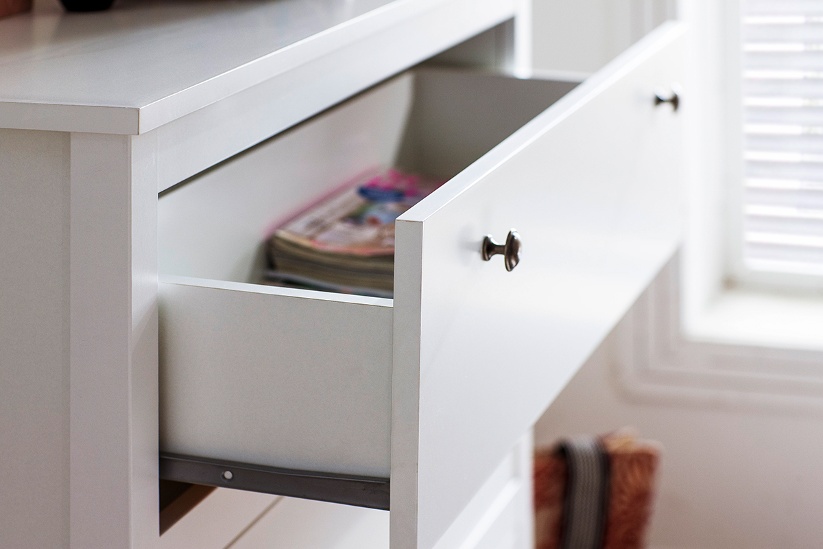 W serii Farge występują trzy, różne komody, najmniejszą z nich jest mała bieliźniarka prezentowana poniżej. Mimo swoich niewielkich rozmiarów - 92x98x35 cm, jest niezwykle pojemna. Wnętrze meble zostało wyposażone w trzy szerokie szuflady na prowadnicach kulkowych, co pozwoliło na pełne, bezproblemowe otwieranie. Elegancki charakter mebla został podtrzymany poprzez dobór prostych, uchwytów w kolorze postarzanego metalu.