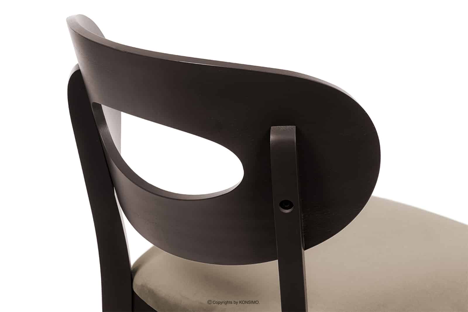 Stabilność krzesła zapewnia rama wykonana z litego drewna. Siedzisko zostało wykonane z pianki poliuretanowej obitej wysokiej jakości tkaniną. To połączenie świetnie prezentuje się ze stołami w stylu klasycznym z nawiązaniem do wnętrz retro. Zakrzywione oparcie z wycięciem w środku sprawia, że krzesła się wyróżniają i są bardzo wygodne.