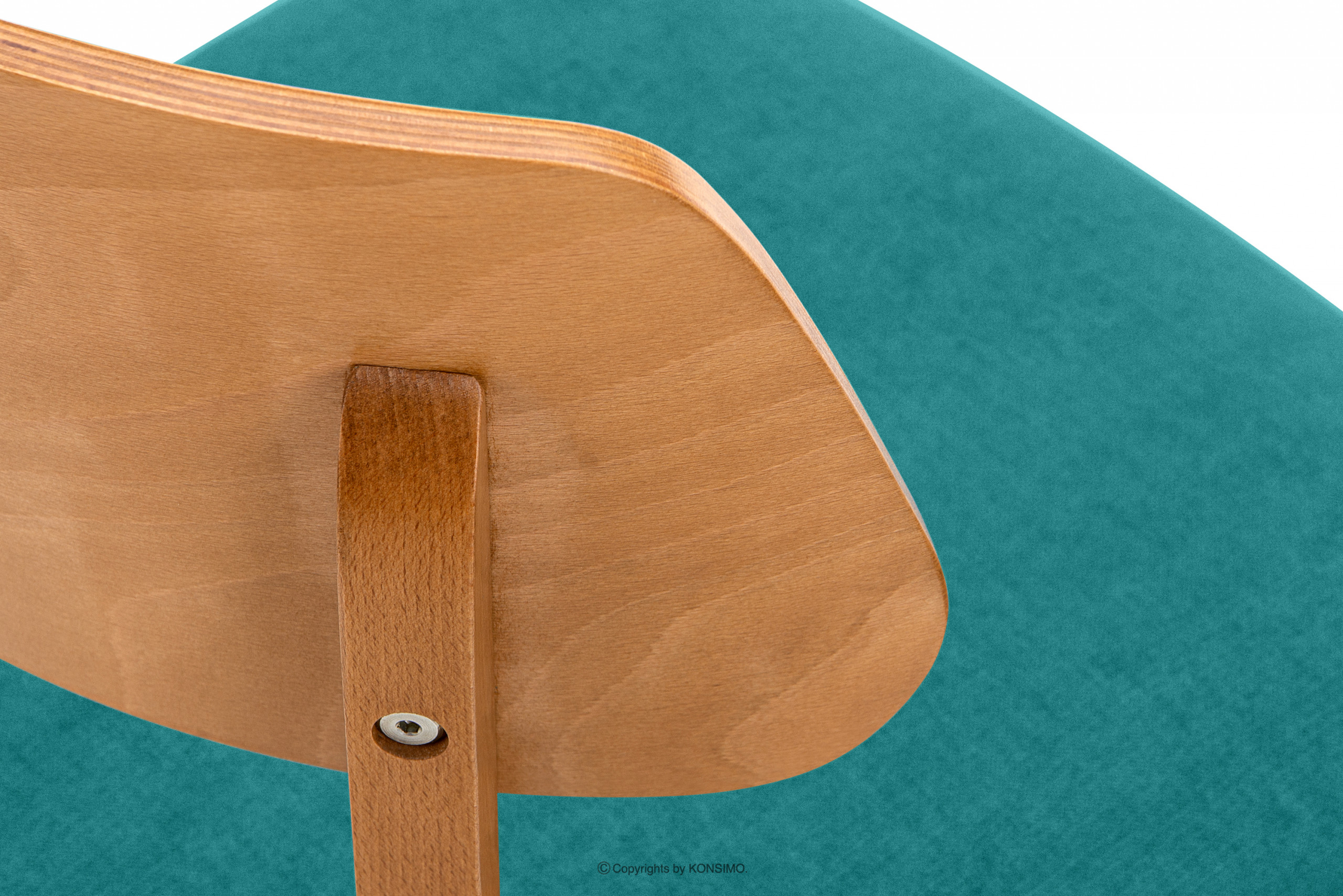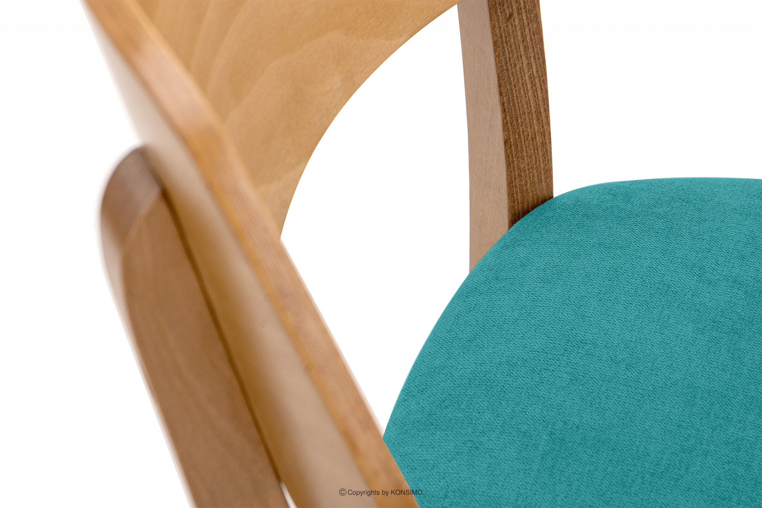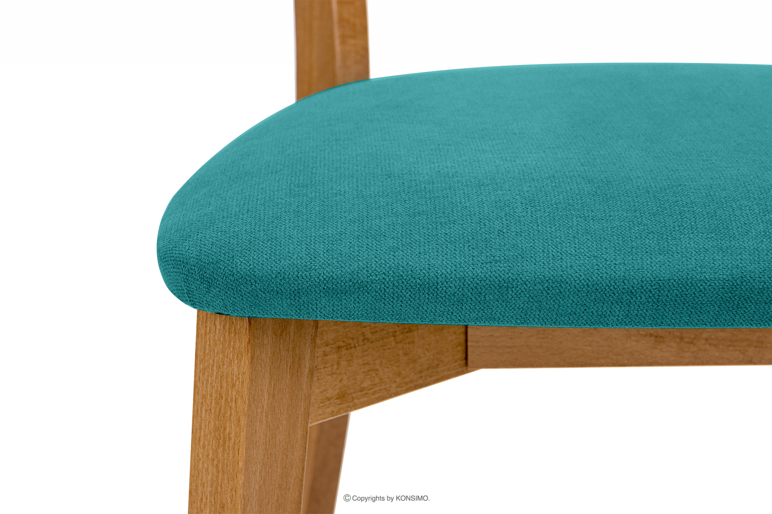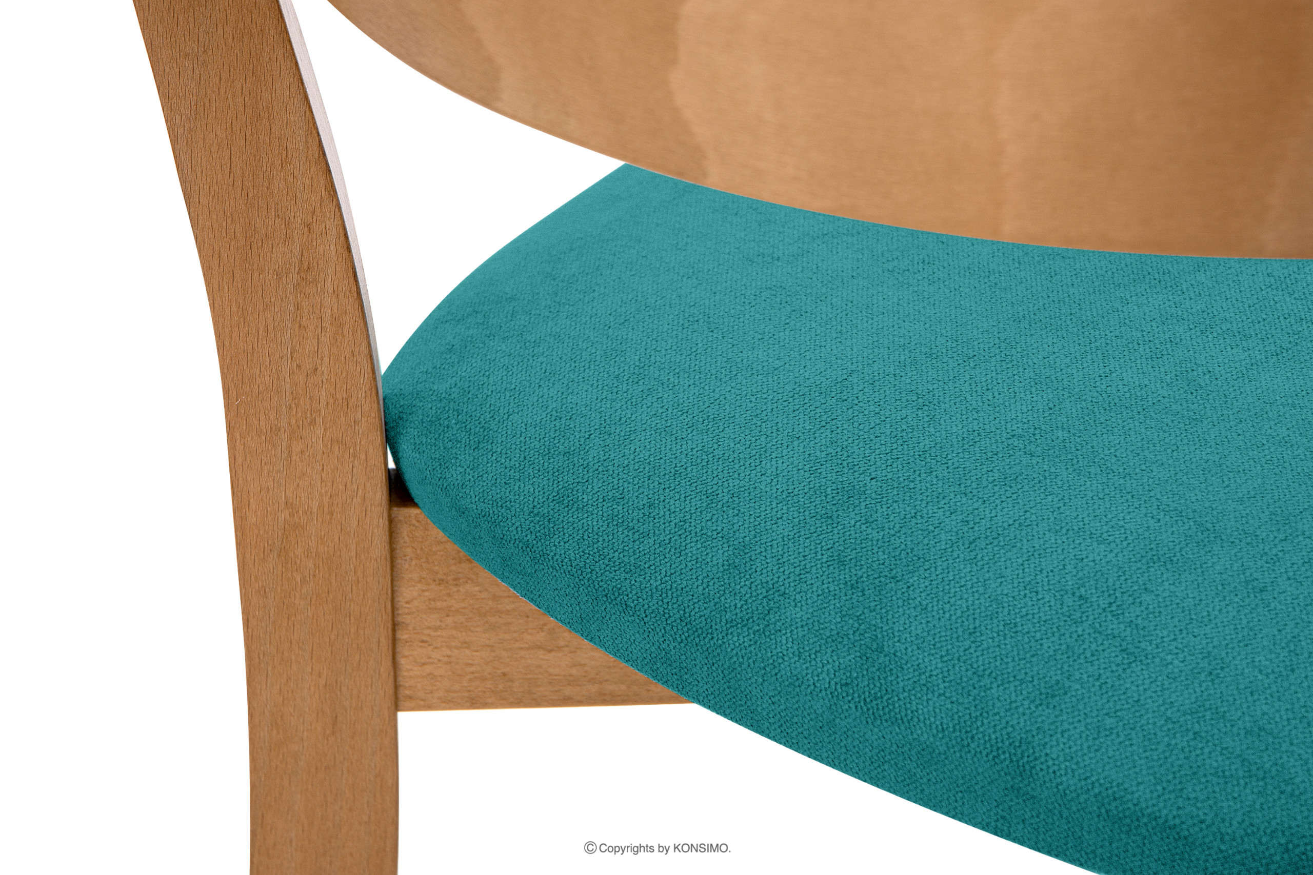 Krzesło VINIS sprawdzi się nie tylko w jadalni, ale również w salonie. Ze względu na ergonomiczny i ciekawy kształt jest nie tylko stylowy, ale także zapewnia maksymalny komfort. Odpowiednie drewniane krzesło ociepla wnętrze i czyni je bardziej komfortowym. Drewniane nogi wraz z oparciem w kolorze jasnego dębu idealnie komponują się z turkusową tapicerką.