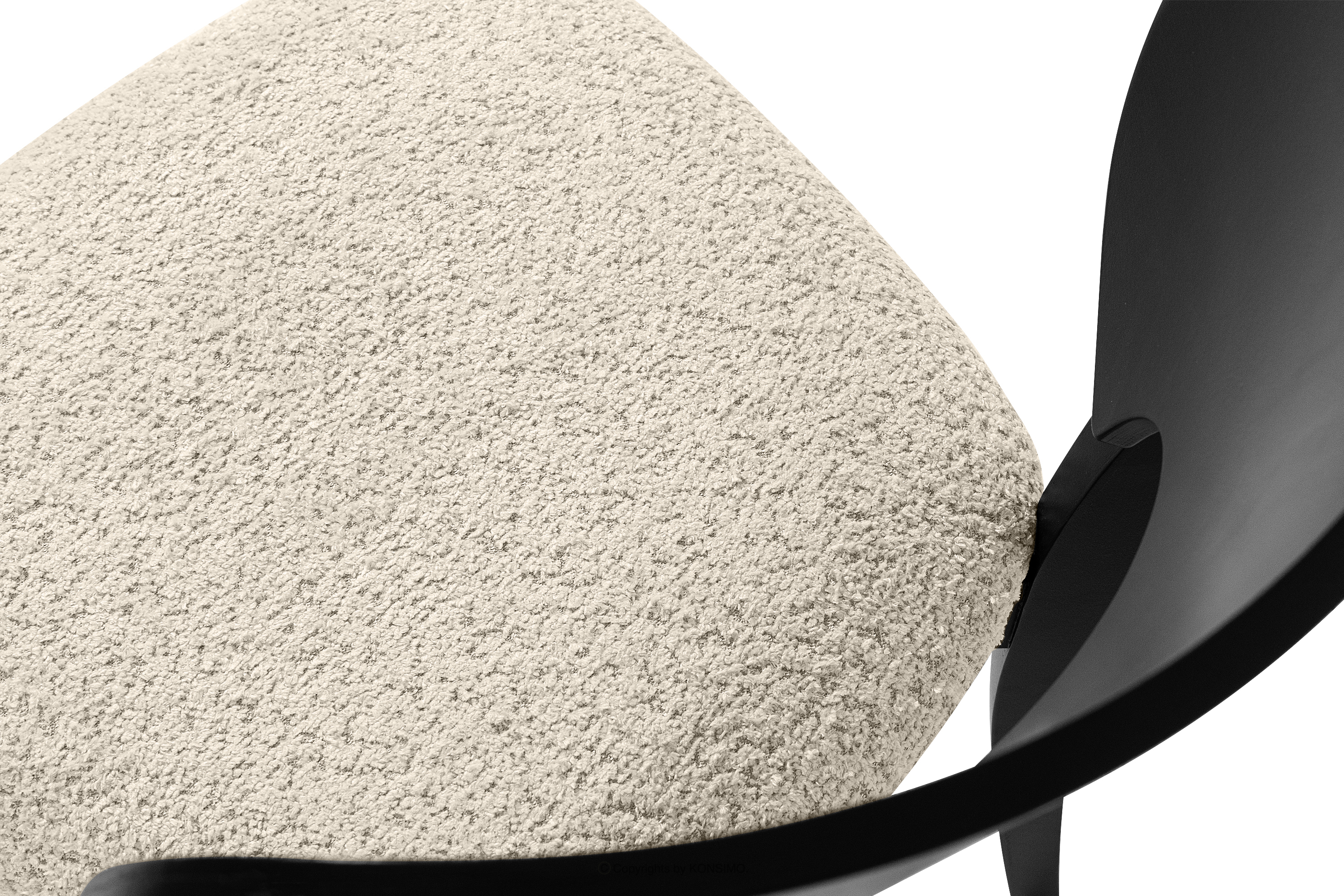 Siedzisko krzesła zostało wypełnione pianką poliuretanową i obite tkaniną boucle. Łatwo je utrzymać w czystości, a do tego materiał jest miły w dotyku. Oprócz tego wygodę zapewnia również delikatnie wygięte siedzisko, które jest dopasowane do użytkownika. Oczywiście pełni także funkcję estetyczną, świetnie wygląda wraz z lekko zagiętymi nogami.