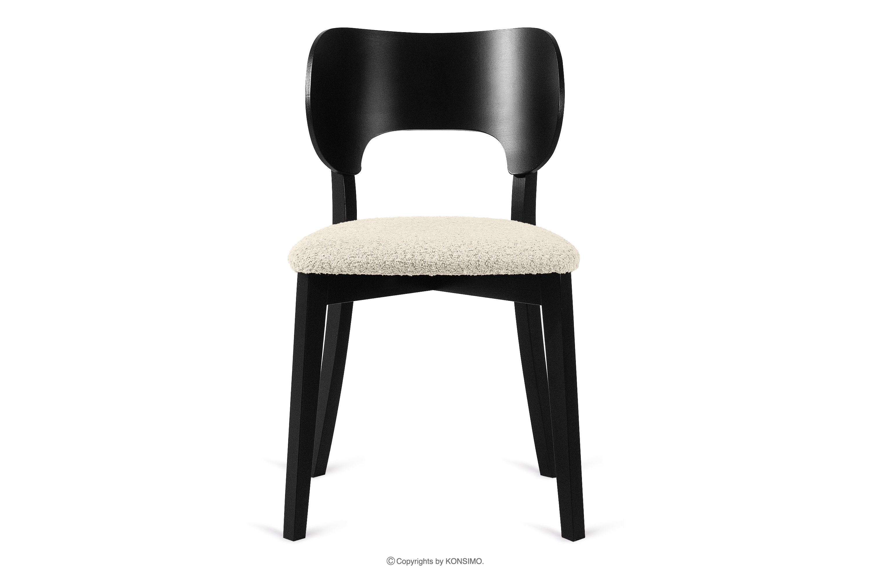 Siedzisko krzesła zostało wypełnione pianką poliuretanową i obite tkaniną boucle. Łatwo je utrzymać w czystości, a do tego materiał jest miły w dotyku. Oprócz tego wygodę zapewnia również delikatnie wygięte siedzisko, które jest dopasowane do użytkownika. Oczywiście pełni także funkcję estetyczną, świetnie wygląda wraz z lekko zagiętymi nogami.