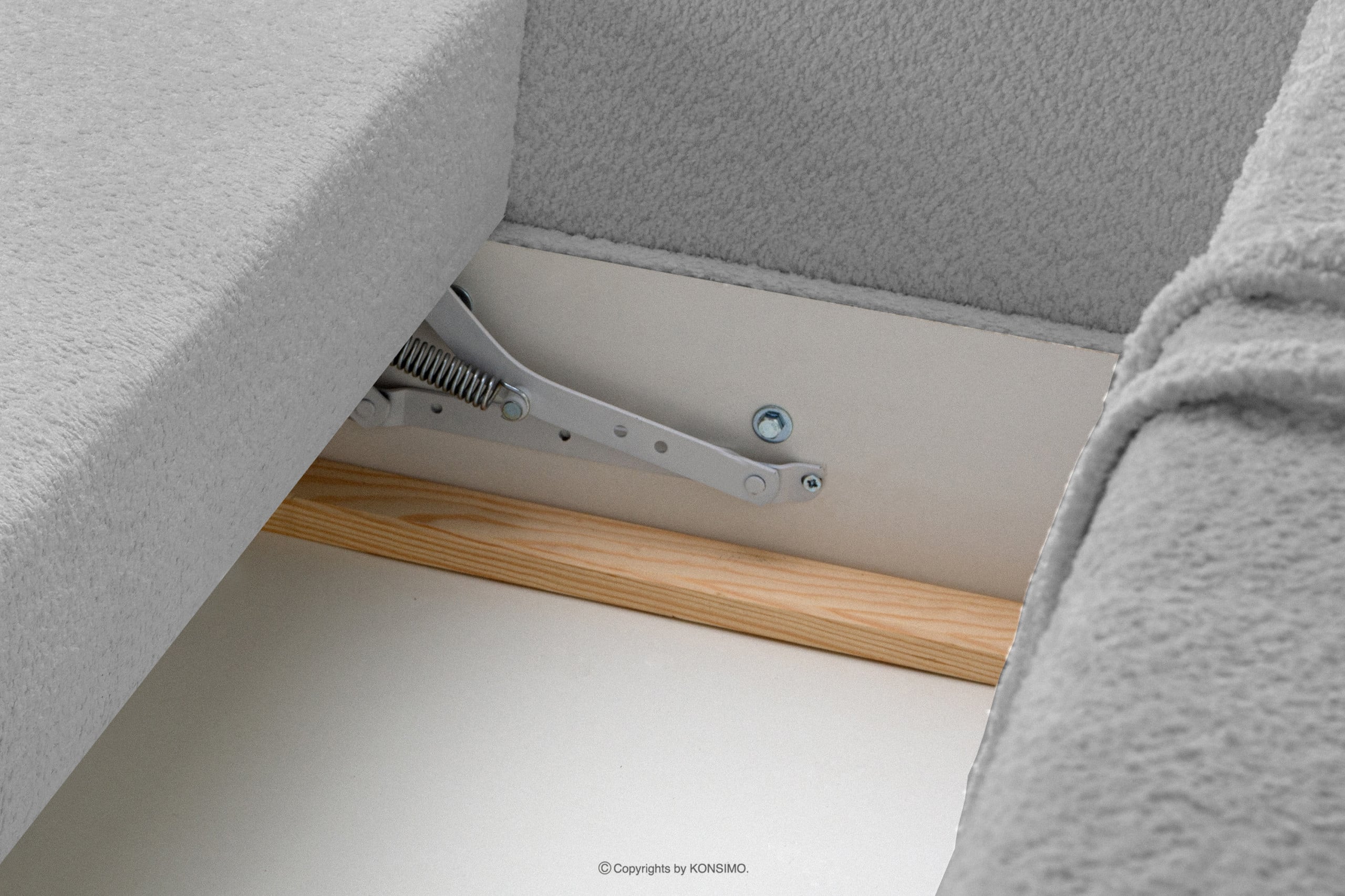 Skandynawska sofa w tkaninie baranek jasnoszara w stylu skandynawskim, charakteryzuje się jasnymi drewnianymi nogami i pikowaniami. Ponadto jej kolor idealnie pasuje do nordyckiej mody. Posiada funkcję spania oraz pojemnik na pościel, co przydaje się szczególnie w małych pomieszczeniach. Wykorzystuje system DL, który jest bardzo prosty i szybki w użyciu. Siedziska wypełnione są pianką T30 oraz wykorzystują sprężyny faliste typu B, dzięki ich zastosowaniu sofa nie zapada się, a pianka nie odkształca się.