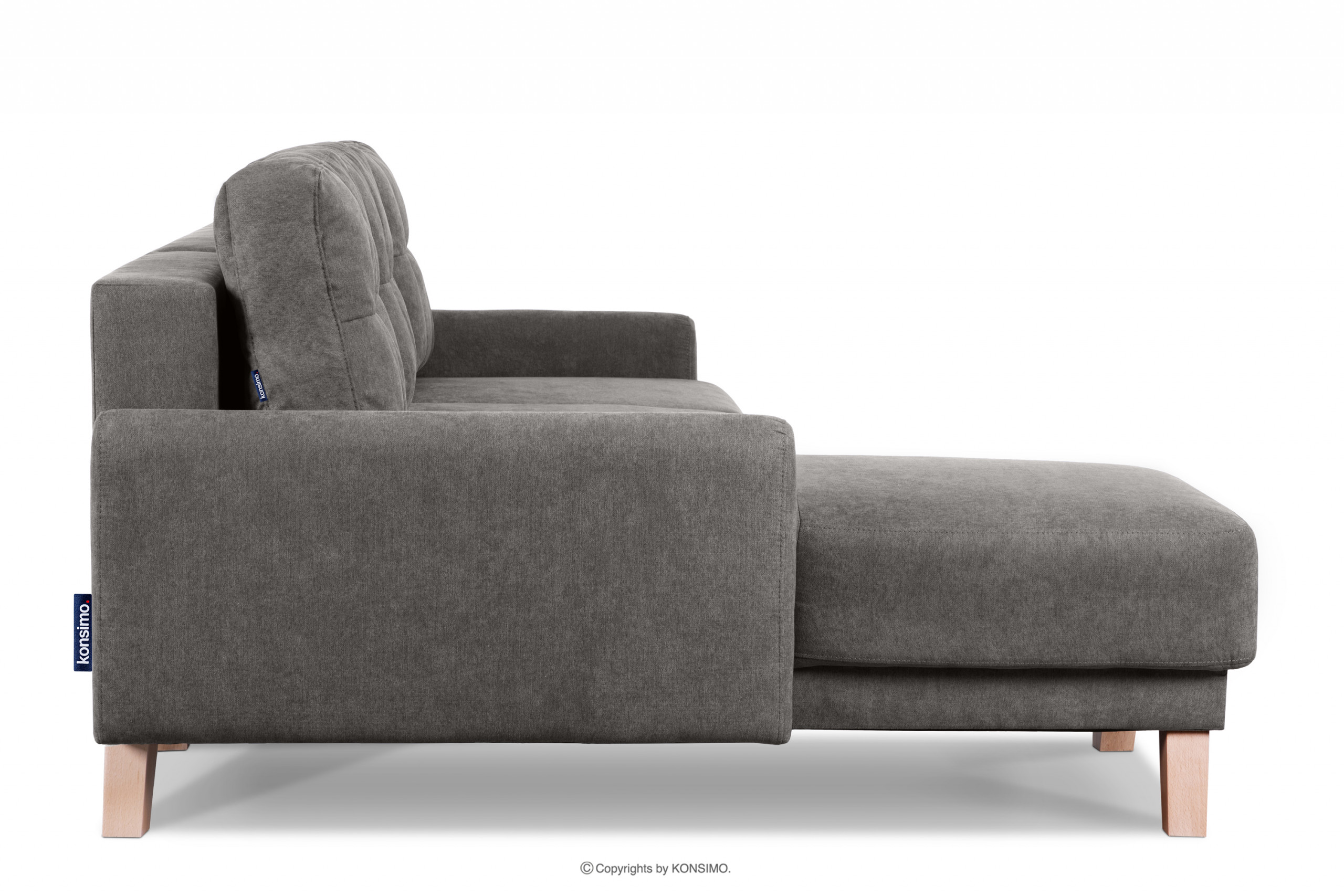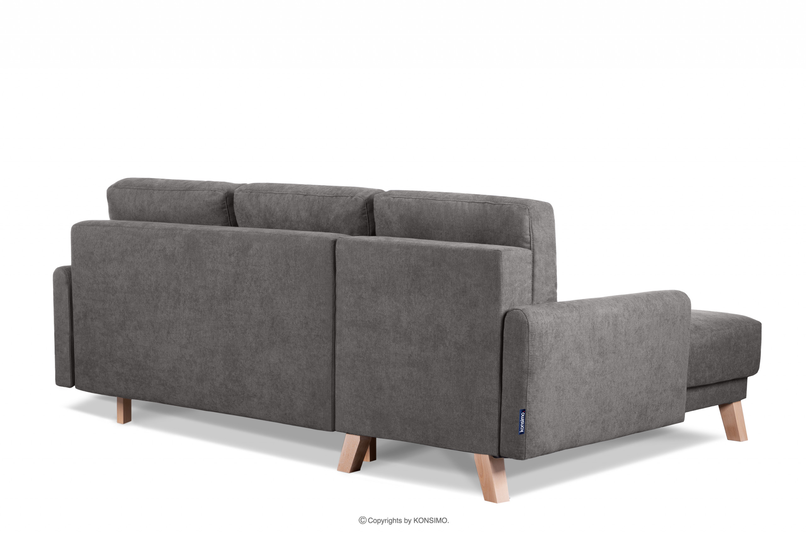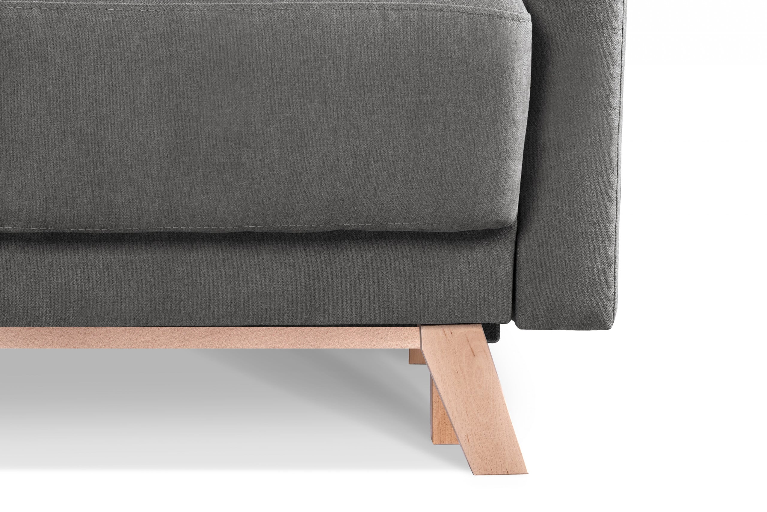 Narożnik rozkładany do salonu z pojemnikiem na pościel szary lewy w stylu skandynawskim, charakteryzujący się drewnianymi bukowymi nóżkami i wstawkami. Posiada funkcję spania oraz pojemnik na pościel, co przydaje się szczególnie w małych pomieszczeniach. Wykorzystuje system DL, który jest bardzo łatwy i szybki w użyciu. Siedzisko wypełnione jest pianką T30 oraz zastosowano w nim sprężyny faliste typu B, dzięki czemu się nie zapada oraz utrzymuje swój kształt.