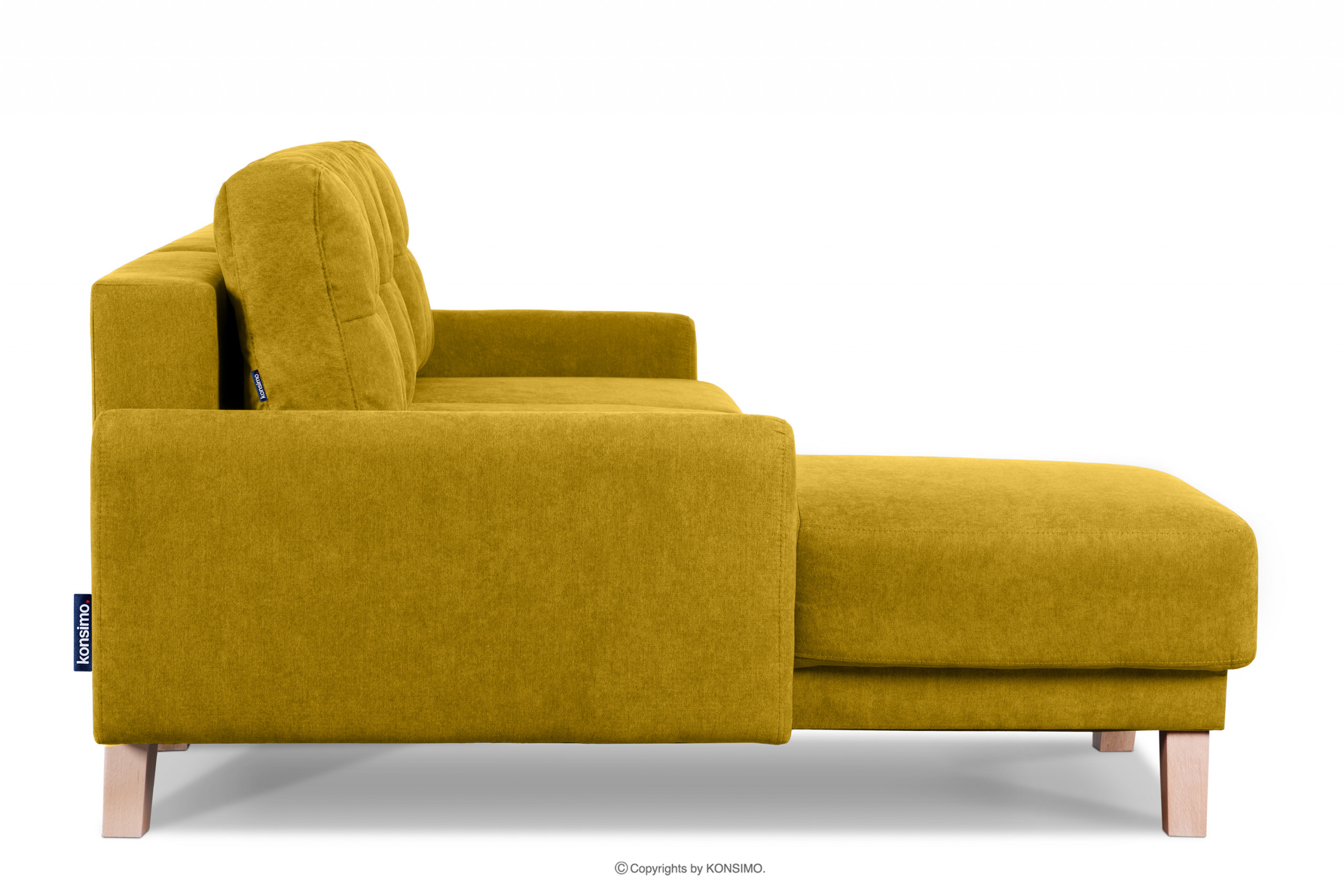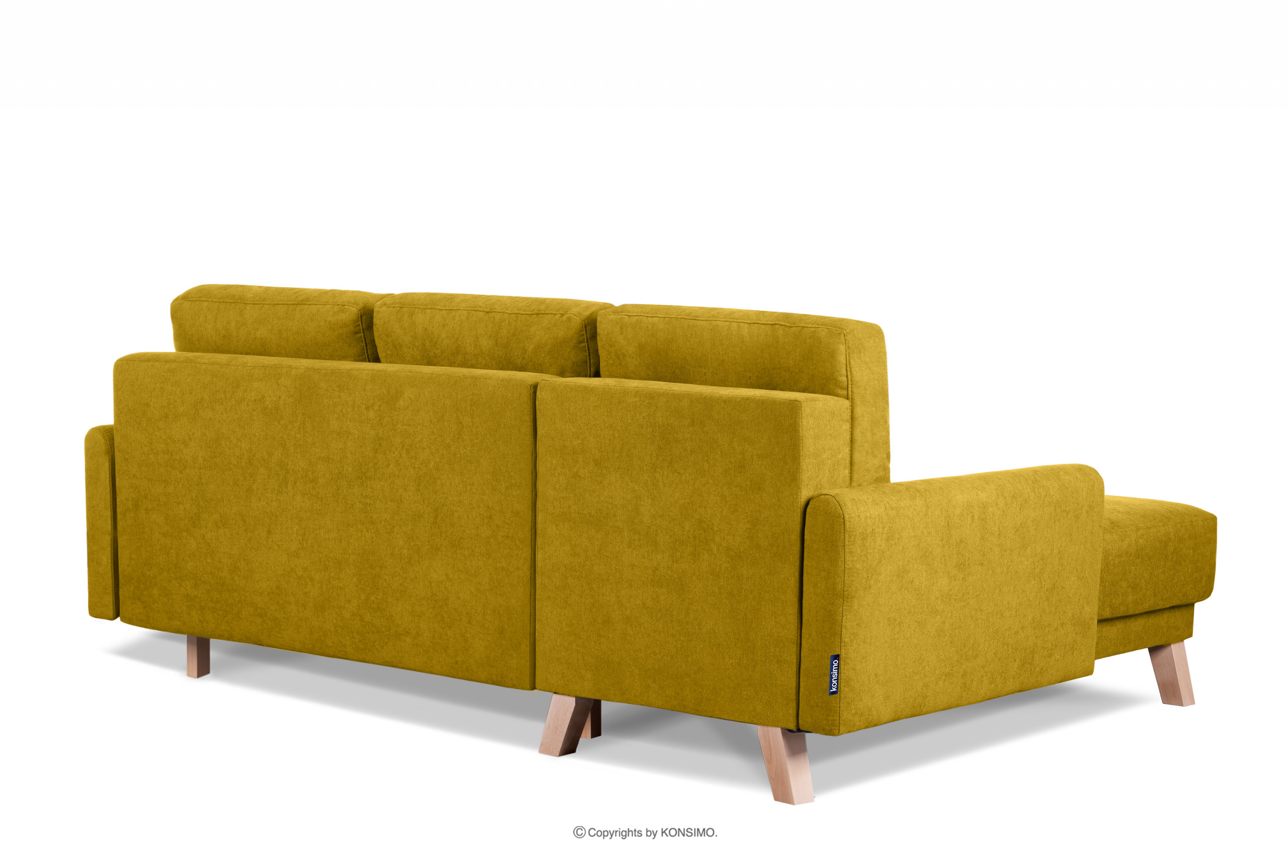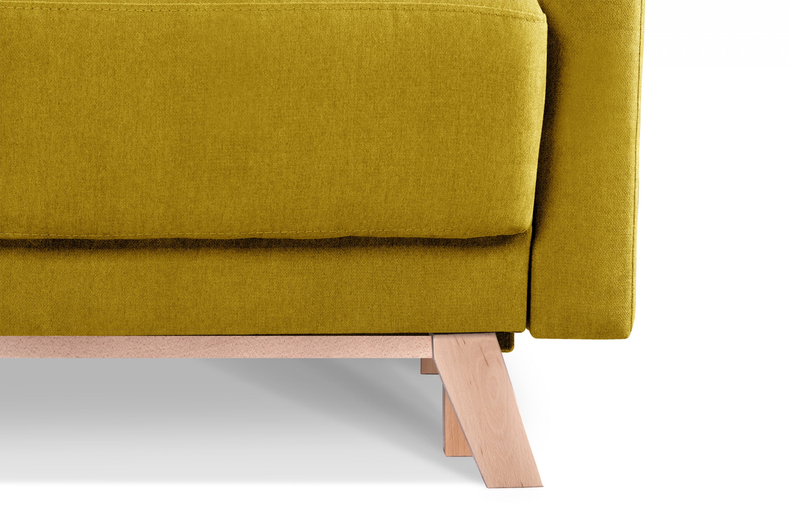 Narożnik rozkładany do salonu z pojemnikiem na pościel żółty lewy w stylu skandynawskim, charakteryzujący się drewnianymi bukowymi nóżkami i wstawkami. Posiada funkcję spania oraz pojemnik na pościel, co przydaje się szczególnie w małych pomieszczeniach. Wykorzystuje system DL, który jest bardzo łatwy i szybki w użyciu. Siedzisko wypełnione jest pianką T30 oraz zastosowano w nim sprężyny faliste typu B, dzięki czemu się nie zapada oraz utrzymuje swój kształt.