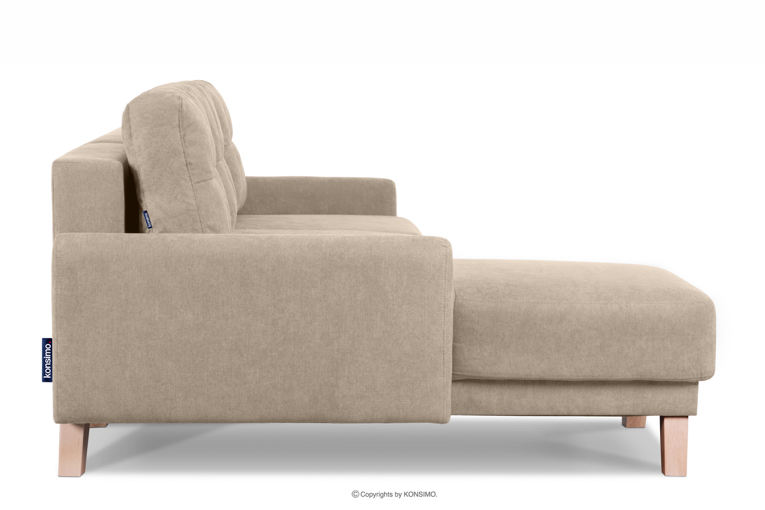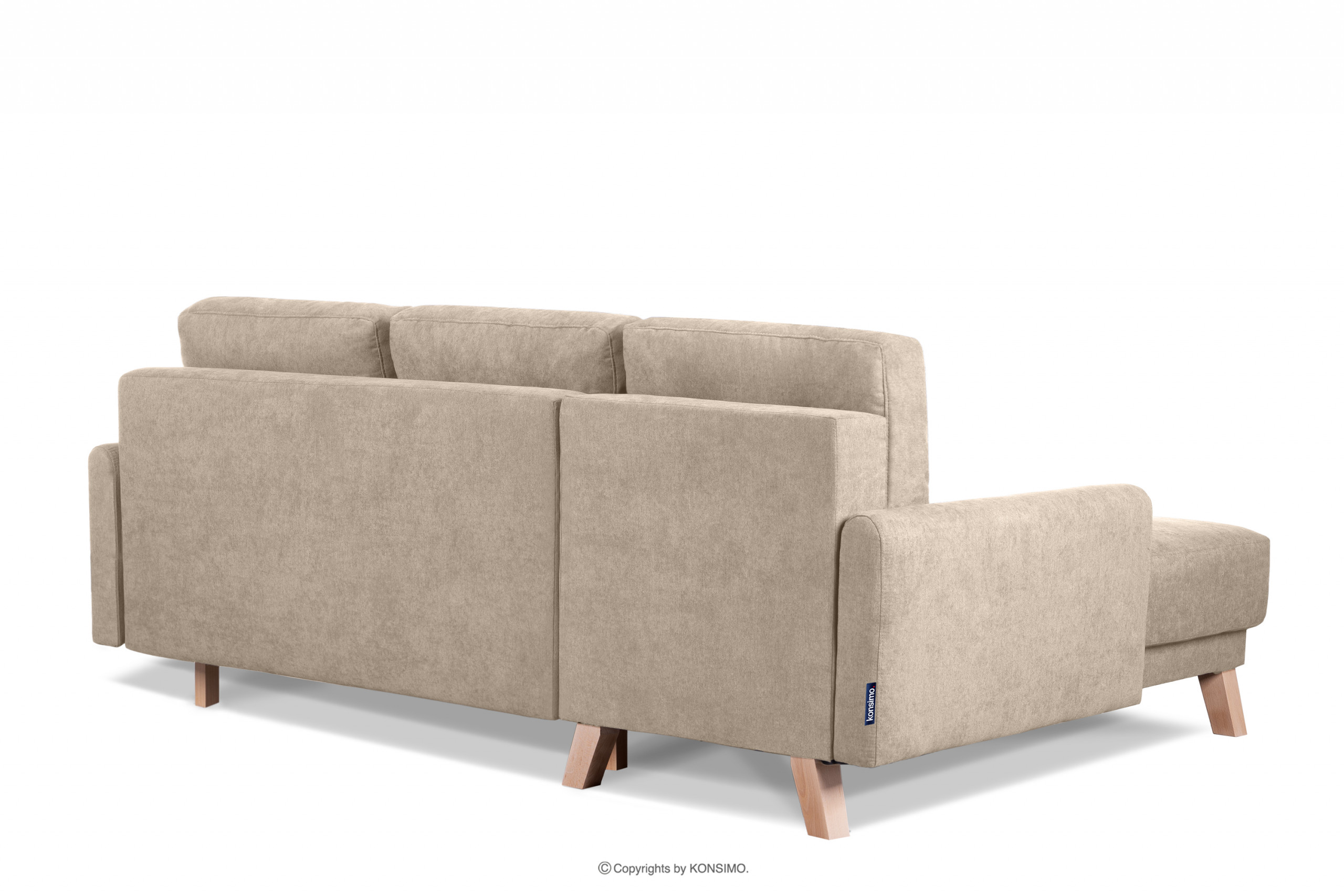 Narożnik rozkładany do salonu z pojemnikiem na pościel beżowy lewy w stylu skandynawskim, charakteryzujący się drewnianymi bukowymi nóżkami i wstawkami. Posiada funkcję spania oraz pojemnik na pościel, co przydaje się szczególnie w małych pomieszczeniach. Wykorzystuje system DL, który jest bardzo łatwy i szybki w użyciu. Siedzisko wypełnione jest pianką T30 oraz zastosowano w nim sprężyny faliste typu B, dzięki czemu się nie zapada oraz utrzymuje swój kształt.