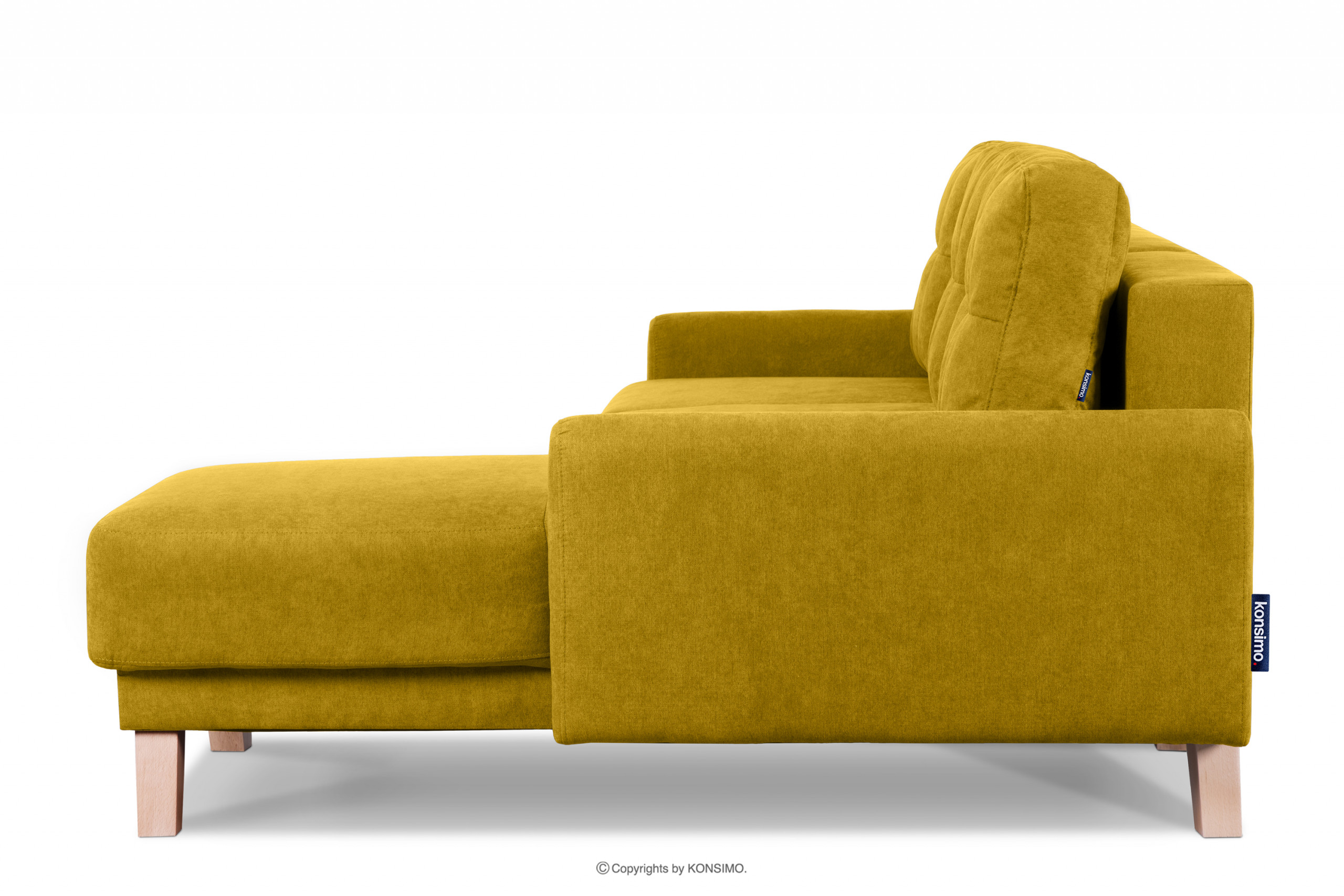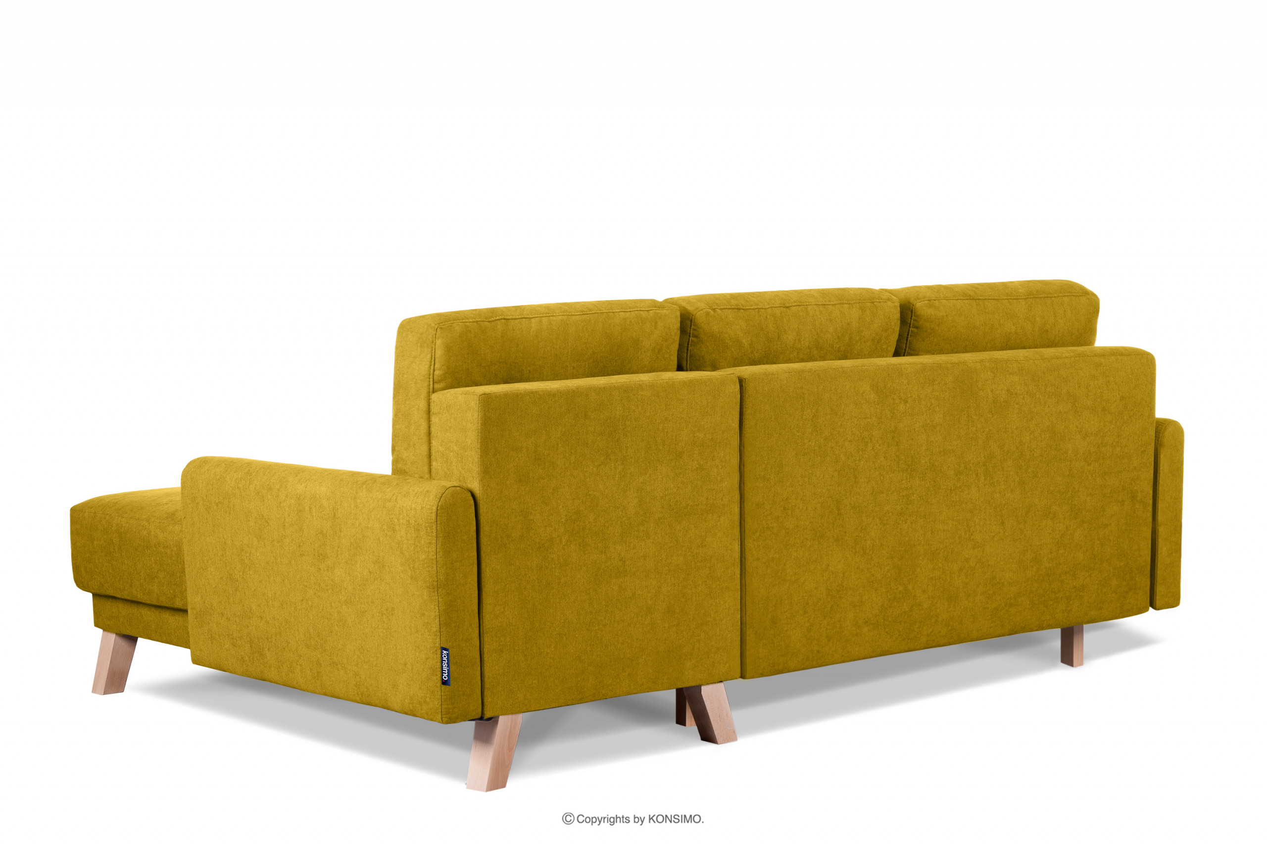 Narożnik rozkładany do salonu z pojemnikiem na pościel żółty prawy w skandynawskim stylu, cechujący się jasnymi drewnianymi nóżkami oraz szczególną funkcjonalnością. Dodatkowo jego kolor idealnie wpasowuje się w modę nordycką. Posiada funkcję spania, oraz pojemnik na pościel, co przydaje się szczególnie w małych pomieszczeniach. Zastosowano w niej system DL, który jest bardzo łatwy i szybki w użyciu.