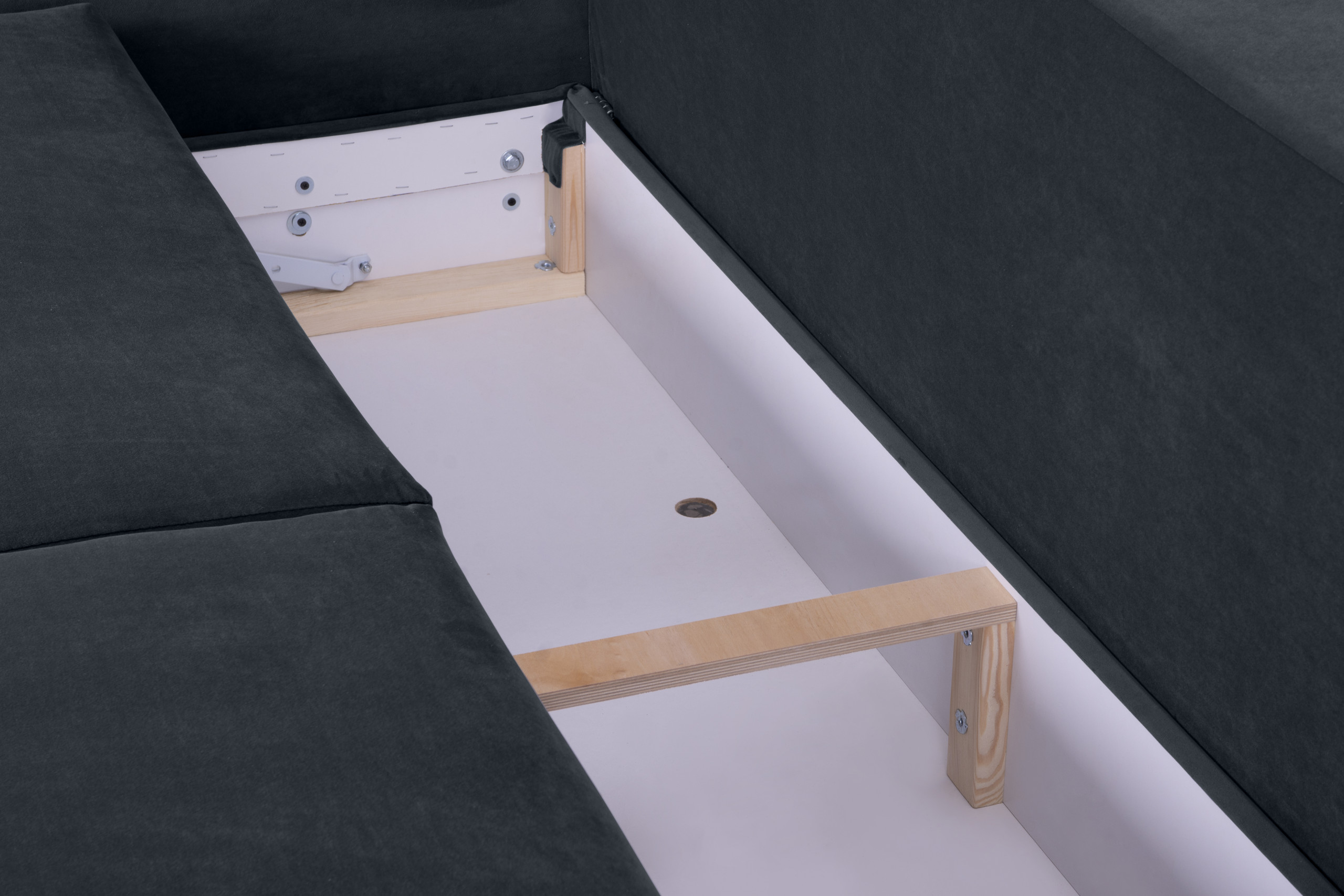 • Materiał stelaża: płyta pilśniowa 3 mm wnętrze: płyta wiórowa 16 mm biała, otapicerowana na obrzeżu Dekor skrzyni, podłogi skrzyni i obrzeża w tym samym wybarwieniu