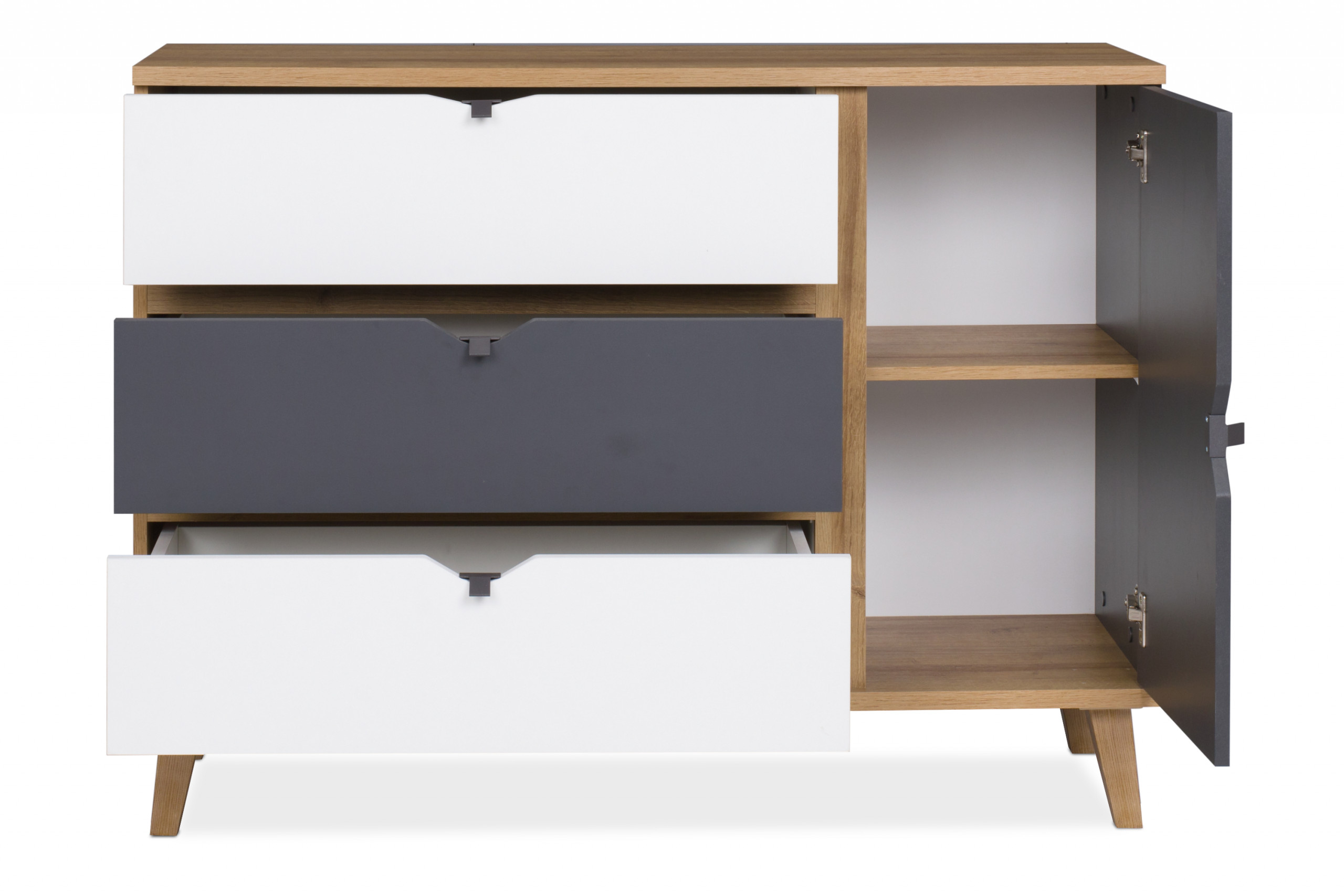 BORIA zobacz całą kolekcję Komoda z szufladami i półkami do pokoju nastolatka- kolor dąb złoty/biały matowy/grafit