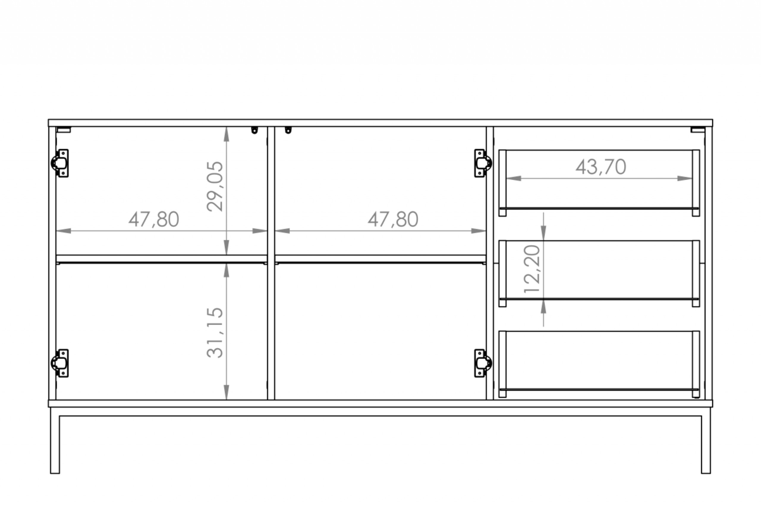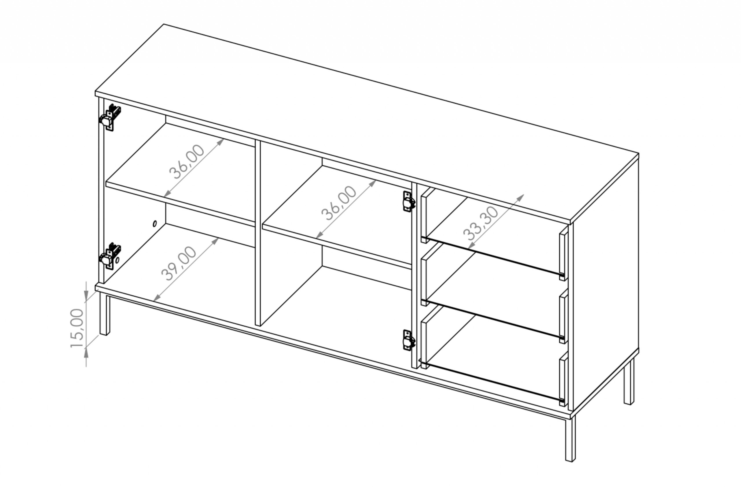 Komoda została wykonana z płyty wiórowej, gwarantując stabilność i wytrzymałość na lata, a tylna ściana z płyty HDF. Posiada trzy pojemne szuflady z wykorzystaniem prowadnic dolnego montażu, dzięki czemu nie wypadają, są wytrzymałe oraz mniej widoczne od standardowych. Komoda ma również dwie szafki z otwieranymi drzwiami typu push to open. Każda z nich posiada półkę, co ułatwia utrzymanie porządku i organizację.