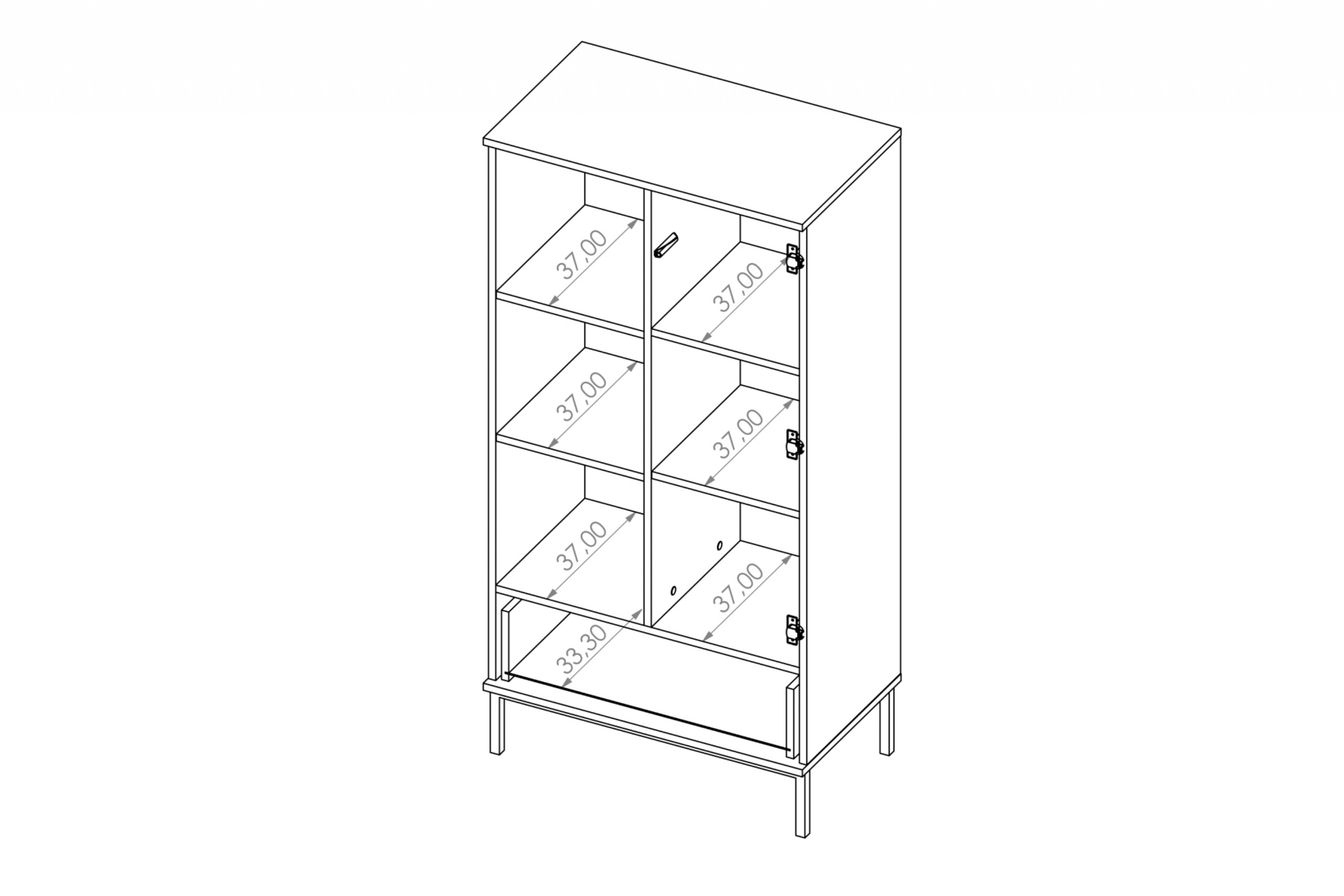 Regał został wykonany z płyty wiórowej, gwarantując stabilność i wytrzymałość na lata, a tylna ściana z płyty HDF. Posiada dużą szufladę z wykorzystaniem prowadnic dolnego montażu, dzięki czemu nie wypadają, są wytrzymałe oraz mniej widoczne od standardowych. Regał jest częściowo zamknięty - dwie półki są schowane za drzwiami, a reszta jest widoczna.