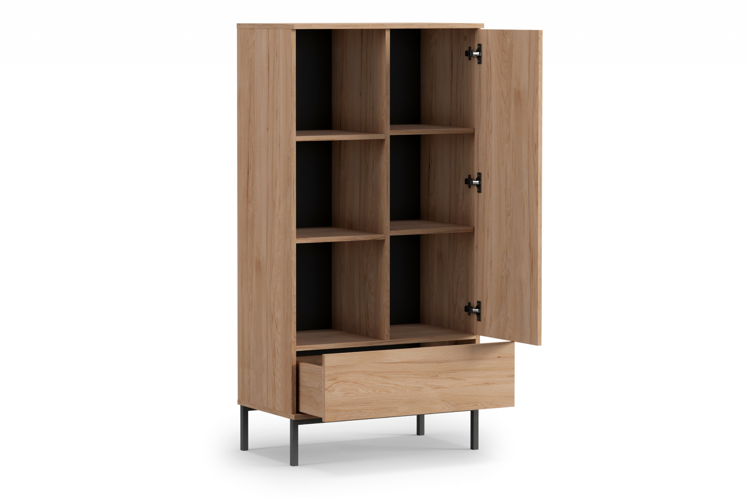 Regał został wykonany z płyty wiórowej, gwarantując stabilność i wytrzymałość na lata, a tylna ściana z płyty HDF. Posiada dużą szufladę z wykorzystaniem prowadnic dolnego montażu, dzięki czemu nie wypadają, są wytrzymałe oraz mniej widoczne od standardowych. Regał jest częściowo zamknięty - dwie półki są schowane za drzwiami, a reszta jest widoczna.