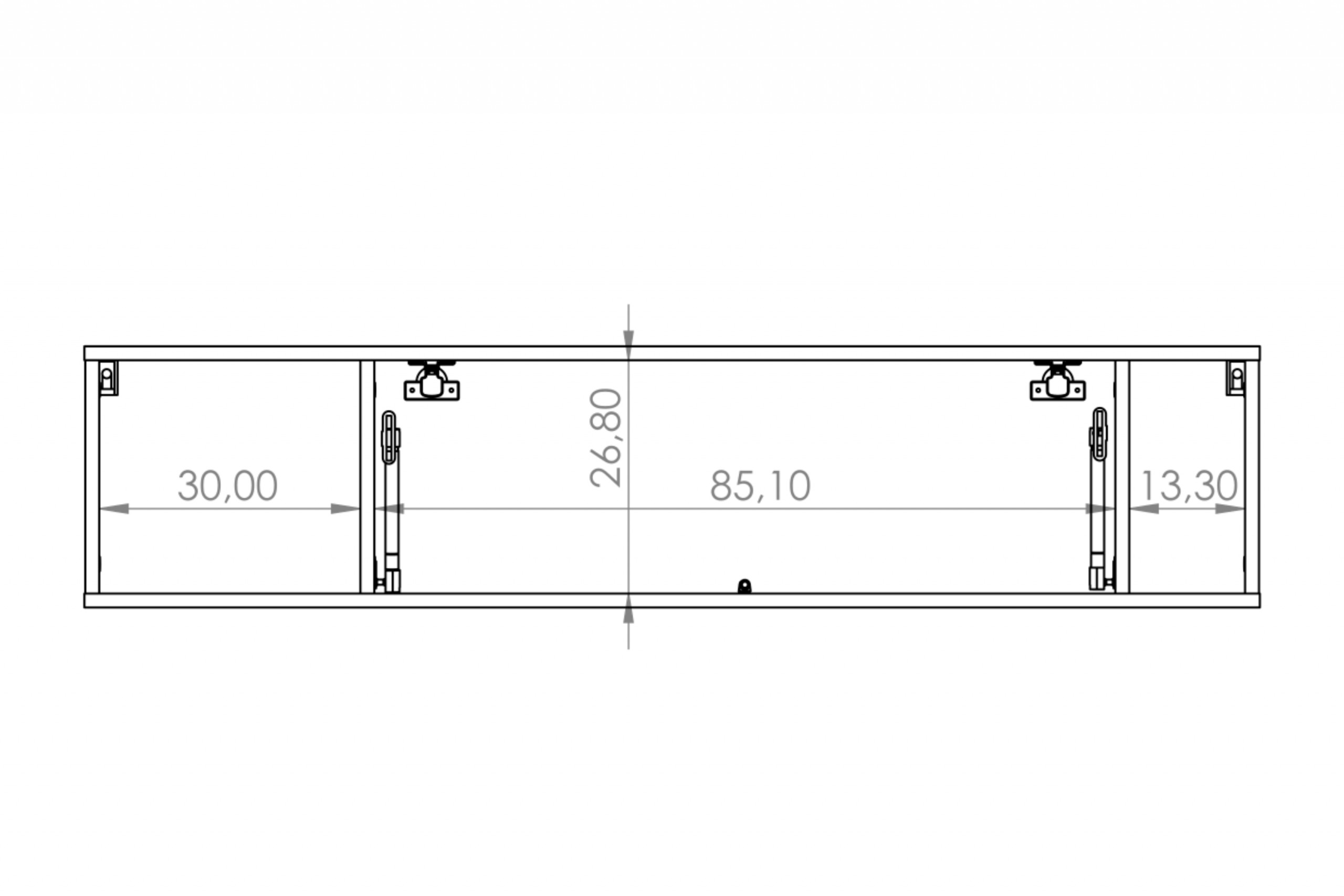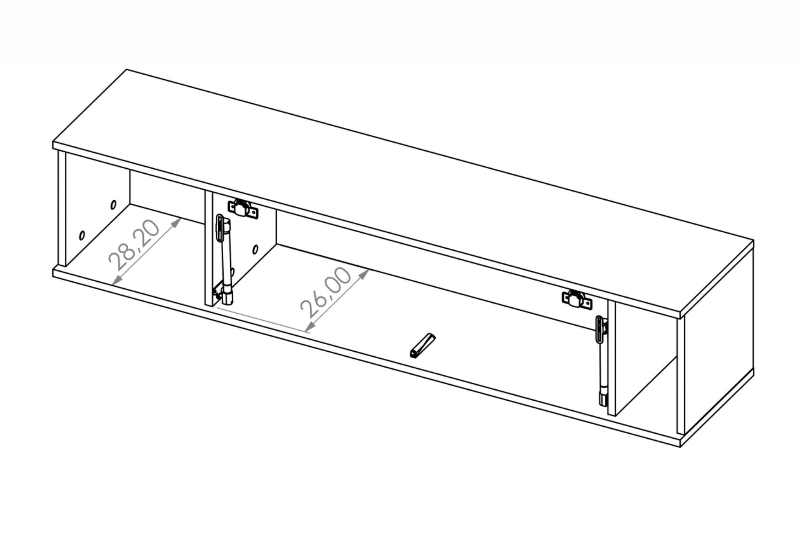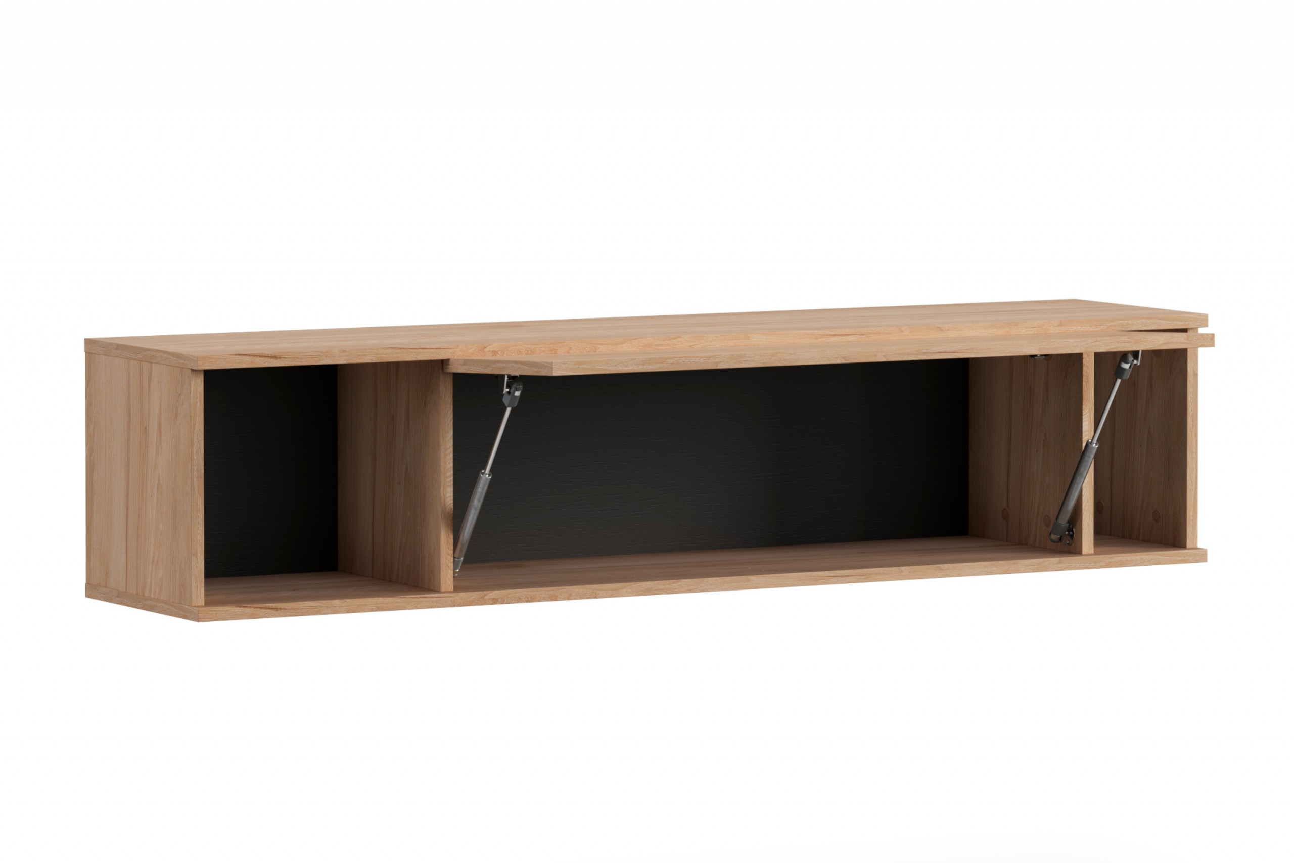 Szafka wisząca została wykonana z płyty wiórowej, gwarantując stabilność i wytrzymałość na lata, a tylna ściana z płyty HDF. Zamykana półka, znajdująca się pomiędzy dwoma otwartymi, otwierana jest za pomocą siłowników gazowych. Drzwi otwierają się uchylnie, co w przypadku takich mebli jest niezwykle funkcjonalne.